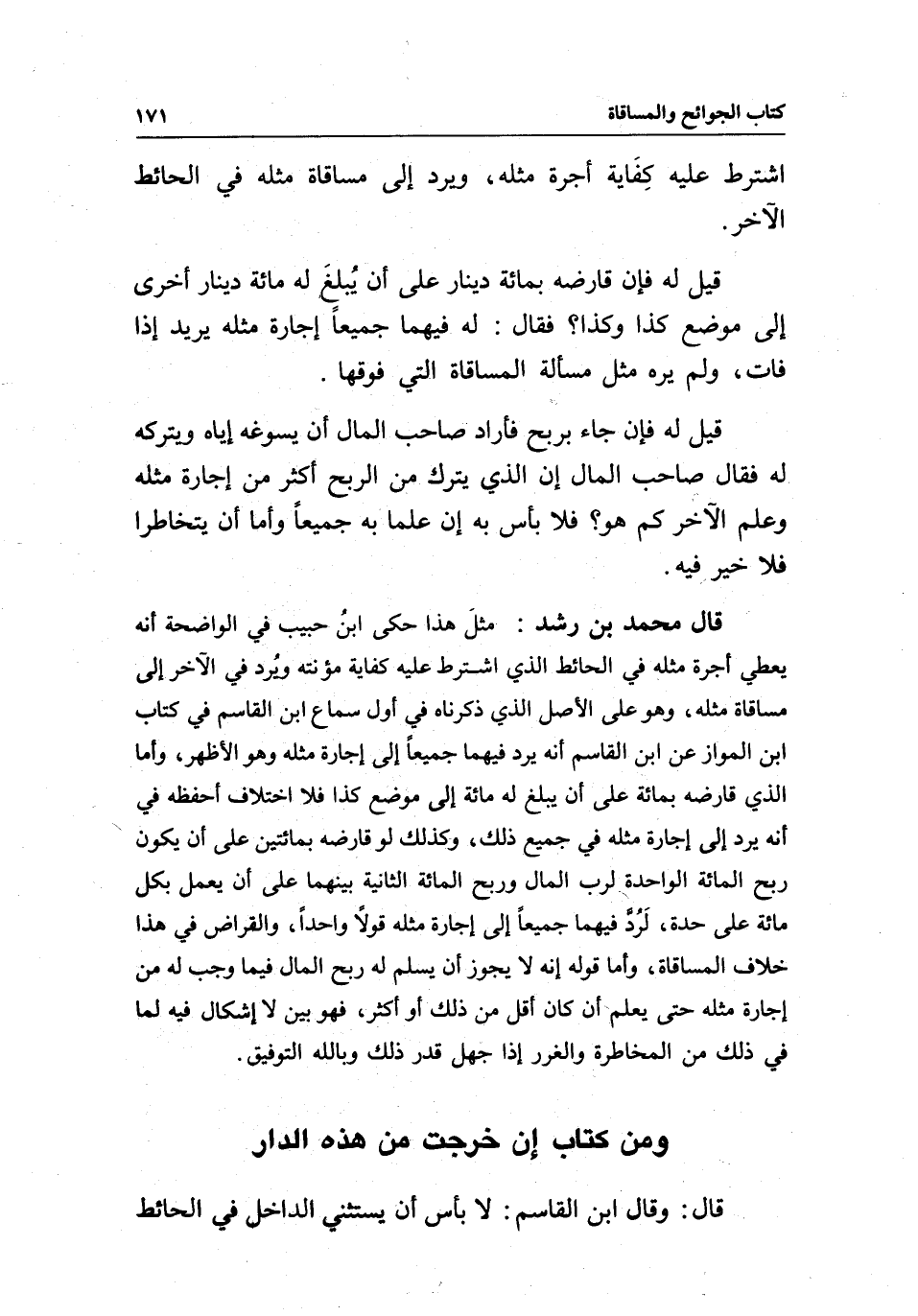 قال محمد بن رشد: مثلَ هذا حكى ابنُ حبيب في الواضحة أنه يعطي أجرة مثله في الحائط الذي اشترط عليه كفاية مؤنته وُيرد في الآخر إلى مساقاة مثله، وهو على الأصل الذي ذكرناه في أول سماع ابن القاسم في كتاب ابن المواز عن ابن القاسم أنه يرد فيهما جميعا إلى إجارة مثله وهو الأظهر، وأما الذي قارضه بمائة على أن يبلغ له مائة إلى موضع كذا فلا اختلاف أحفظه فيِ أنه يرد إلى إجارة مثله في جميع ذلك، وكذلك لو قارضه بمائتين على أن يكون ربح المائة الواحدة لرب المال وربح المائة الثانية بينهما على أن يعمل بكل مائة على حدة، لَرُدَّ فيهما جميعا إلى إجارة مثله قولا واحدا، والقراض في هذا خلاف المساقاة، وأما قوله إنه لا يجوز أن يسلم له ربح المال فيما وجب له من إجارة مثله حتى يعلم أن كان أقل من ذلك أو أكثر، فهو بين لا إشكال فيه لما في ذلك من المخاطرة والغرر إذا جهل قدر ذلك وبالله التوفيق.