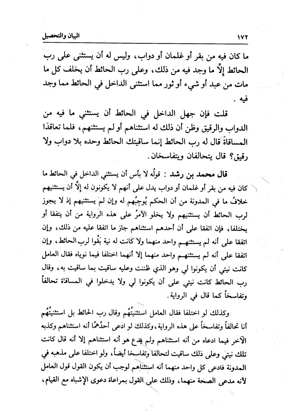 قال محمد بن رشد: قولُه لا بأس أن يستثني الداخل في الحائط ما كان فيه من بقر أو غلمان أو دواب يدل على أنهم لا يكونون له إِلَّا أن يستثنيهم خلافُ ما في المدونة من أن الحكم يُوجِبُهم له وإن لم يستثنيهم إذ لا يجوز لرب الحائط أن يستثنيهم ولا يخلو الأمرُ على هذه الرواية من أن يتفقا أو يختلفا، فإن اتفقا على أن أحدهم استثناهم جاز ما اتفقا عليه من ذلك، وإن اتفقا على أنه لم يستثنهم واحد منهما ولا كانت له نية بَقُوا لرب الحائط، وإن اتَفقا على أنه لم يستثنهم واحد منهما إلا أنهما اختلفا فيما نوياه فقال العامل: كانت نيتي أن يكونوا لي وهو الذي ظننت وعليه ساقيت بما ساقيت به، وقال رب الحائط: كانت نيتي على أن يكونوا لي ولا يدخلوا في المساقاة تحالفا وتفاسخا كما قال في الرواية.