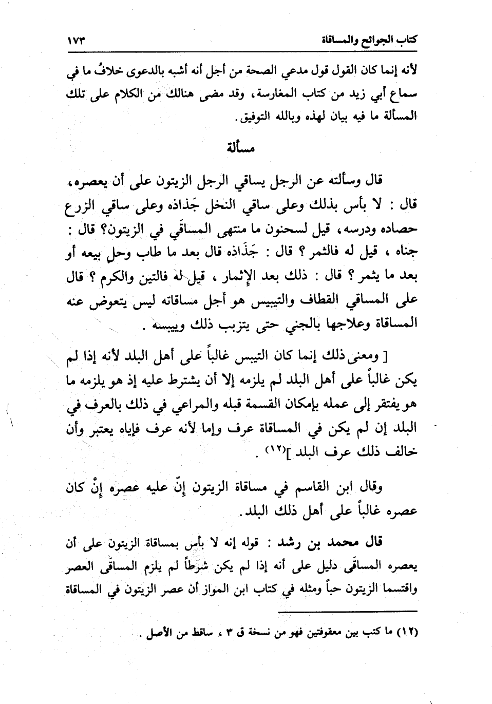 مسألة قال: وسألته عن الرجل يساقي الرجل الزيتون على أن يعصره، قال: لا بأس بذلك وعلى ساقي النخل جَذاذه وعلى ساقي الزرع حصاده ودرسه، قيل لسحنون: ما منتهى المساقَي في الزيتون؟ قال: جناه، قيل له فالثمر؟ قال: جَذَاذه، قال: بعد ما طاب وحل بيعه أو بعد ما يثمر؟ قال: ذلك بعد الِإثمار، قيل له فالتين والكرم؟ قال على المساقي القطاف والتيبيس هو أجل مساقاته ليس يتعوضَ عنه المساقاة وعلاجها بالجني حتى يتزبب ذلك وييبسه.