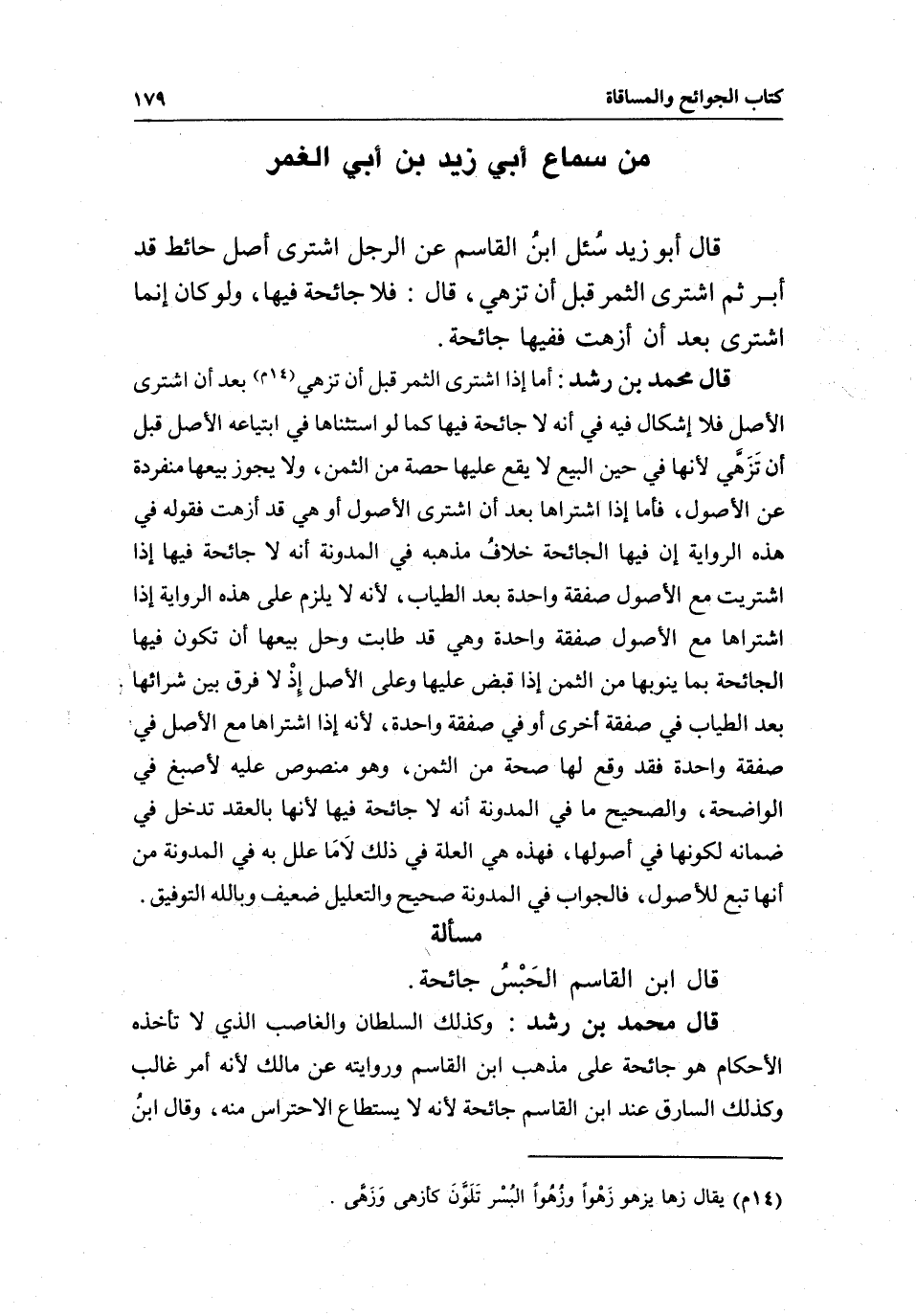 قال أبو زيد سُئل ابنُ القاسم عن الرجل اشترى أصل حائط قد أبر ثم اشترى الثمر قبل أن تزهي، قال: فلا جائحة فيها، ولو كان إنما اشترى بعد أن أزهت ففيها جائحة.