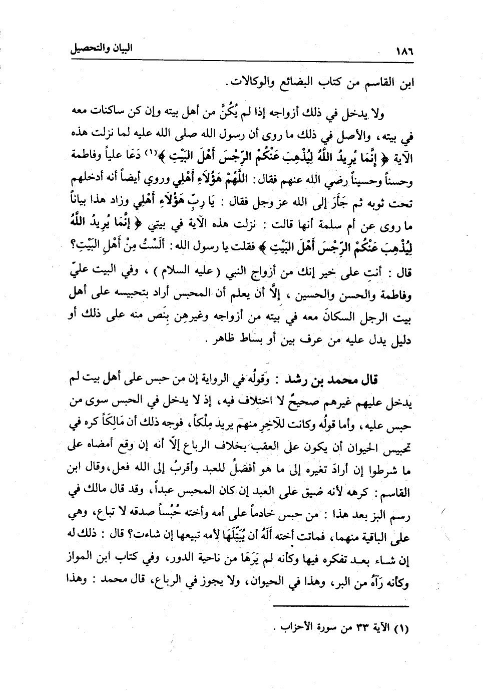 قال محمد بن رشد: وقولُه في الرواية إن من حبس على أهل بيت لم يدخل عليهم غيرهم صحيحٌ لا اختلاف فيه، إذ لا يدخل في الحبس سوى من حبس عليه، وأما قولُه: وكانت للآخِر ِمنهم، يريد مِلْكا، فوجه ذلك أن مَالِكَا كره في تحبيس الحيوان أن يكون على العقب بخلاف الرباع إلّا أنه إن وقع أمضاه على ما شرطوا إن أرادَ تغيره إلى ما هو أفضلُ للعبد وأقربُ إلى الله فعل، وقال ابن القاسم: كرهه لأنه ضيق على العبد إن كان المحبس عبدا، وقد قال مالك في رسم البز بعد هذا: من حبس خادما على أمه وأخته حُبُسا صدقه لا تباع، وهي على الباقية منهما، فماتت أخته أَلَهُ أن يُبَتِّلَهَا لأمه تبيعها إن شاءت؟ قال: ذلك له إن شاء بعد تفكره فيها وكأنه لم يَرَهَا من ناحية الدور، وفي كتاب ابن المواز وكأنه رَآهُ من البر، وهذا في الحيوان، ولا يجوز في الرباع، قال محمد: وهذا