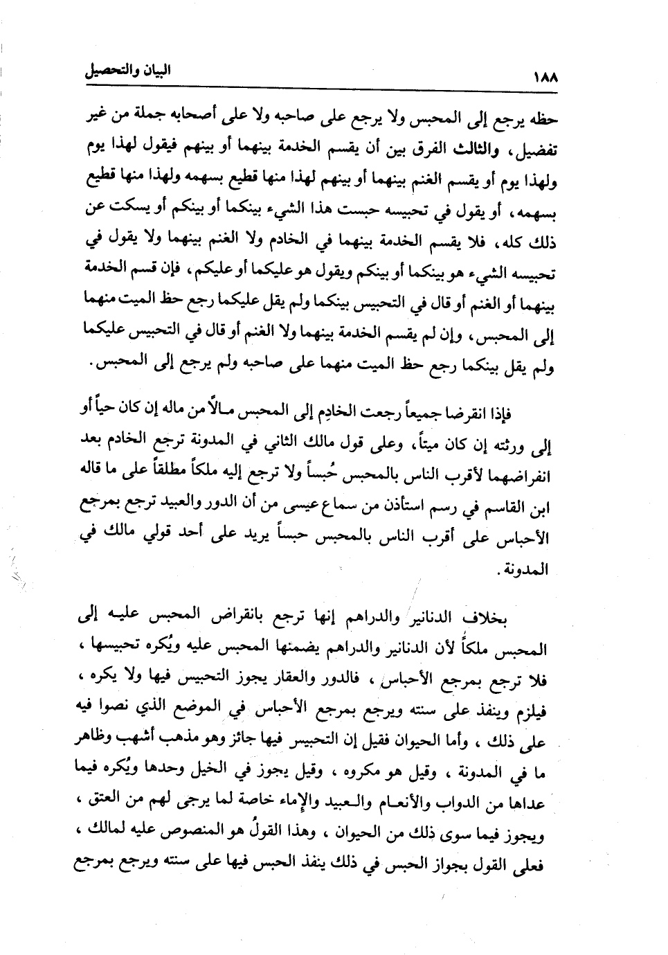 حظه يرجع إلى المحبس ولا يرجع على صاحبه ولا على أصحابه جملة من غير تفضيل، والثالث: الفرق بين أن يقسم الخدمة بينهما أو بينهم فيقول لهذا يوم ولهذا يوم أو يقسم الغنم بينهما أو بينهم لهذا منها قطيع بسهمه ولهذا منها قطيع بسهمه، أو يقول في تحبيسه: حبست هذا الشيء بينكما أو بينكم أو يسكت عن ذلك كله، فلا يقسم الخدمة بينهما في الخادم ولا الغنم بينهما ولا يقول في تحبيسه الشيء: هو بينكما أو بينكم ويقول: هو عليكما أو عليكم، فإن قسم الخدمة بينهما أو الغنم أو قال في التحبيس: بينكما ولم يقل عليكما رجع حظ الميت منهما إلى المحبس، وإن لم يقسم الخدمة بينهما ولا الغنم أو وقال في التحبيس: عليكما ولم يقل بينكما رجع حظ الميت منهما على صاحبه ولم يرجع إلى المحبس.