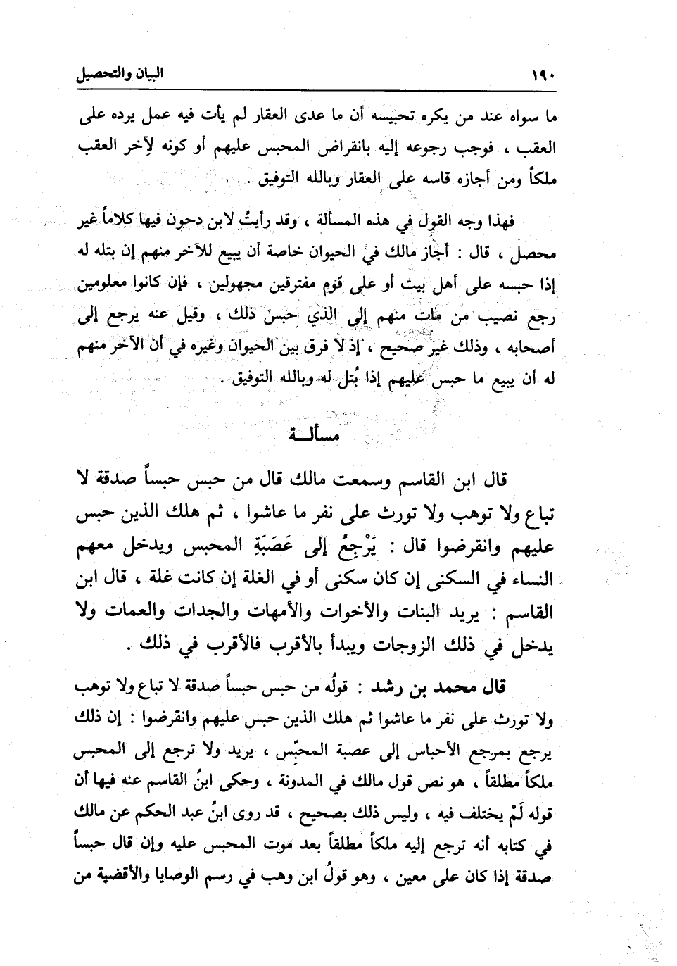 قال محمد بن رشد: قولُه من حبس حبسا صدقة لا تباع ولا توهب ولا تورث على نفر ما عاشوا ثم هلك الذين حبس عليهم وانقرضوا: إن ذلك يرجع بمرجع الأحباس إلى عصبة المحبِّس، يريد ولا ترجع إلى المحبس ملكا مطلقا، هو نص قول مالك في المدونة، وحكى ابنُ القاسم عنه فيها أن قوله لَمْ يختلف فيه، وليس ذلك بصحيح، قد روى ابنُ عبد الحكم عن مالك في كتابه أنه ترجع إليه ملكا مطلقا بعد موت المحبس عليه وإن قال حبسا صدقة إذا كان على معين، وهو قولُ ابن وهب في رسم الوصايا والأقضية من