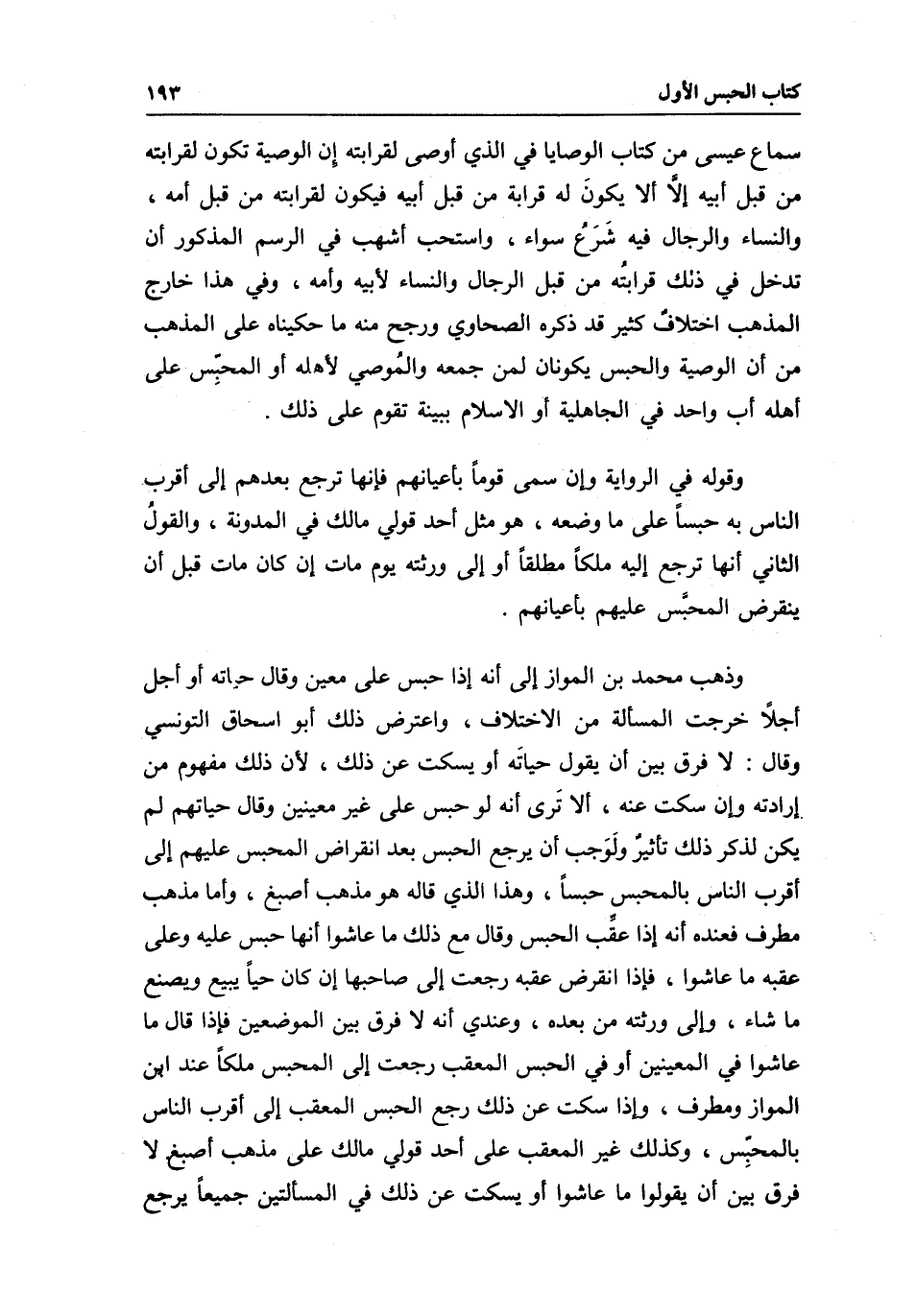 سماع عيسى من كتاب الوصايا في الذي أوصى لقرابته إِن الوصية تكون لقرابته من قبل أبيه إلَّا ألا يكونَ له قرابة من قبل أبيه فيكون لقرابته من قبل أمه، والنساء والرجال فيه شَرَعُ سواء، واستحب أشهب في الرسم المذكور أن تدخل في ذلك قرابتُه من قبل الرجال والنساء لأبيه وأمه، وفي هذا خارج المذهب اختلافٌ كثير قد ذكره الطحاوي ورجح منه ما حكيناه على المذهب من أن الوصية والحبس يكونان لمن جمعه والمُوصي لأهله أو المحبِّس على أهله أب واحد في الجاهلية أو الإسلام ببينة تقوم على ذلك.