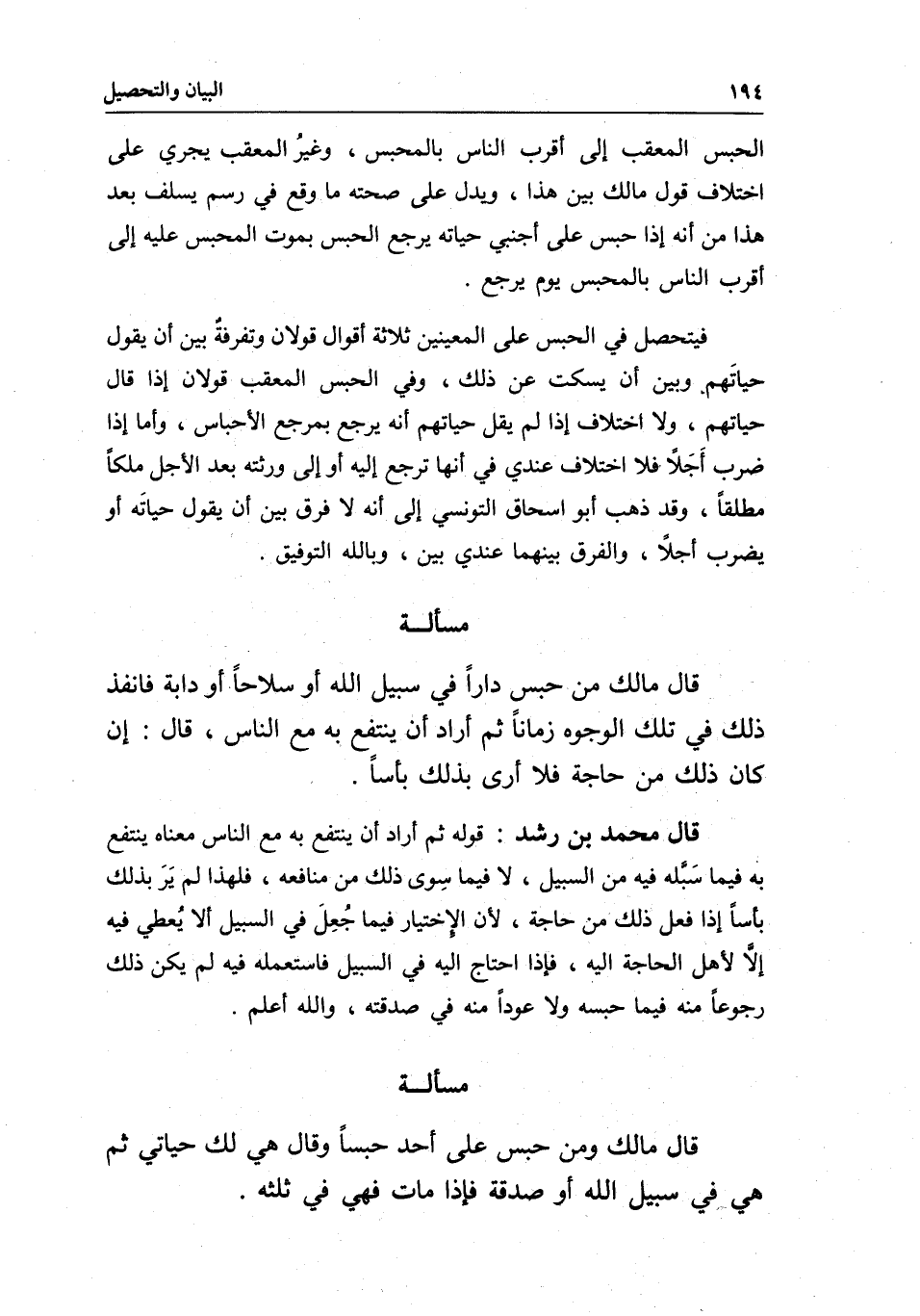 الحبس المعقب إلى أقرب الناس بالمحبس، وغيرُ المعقب يجري على اختلاف قول مالك بين هذا، ويدل على صحته ما وقع في رسم يسلف بعد هذا من أنه إذا حبس على أجنبي حياته يرجع الحبس بموت المحبس عليه إلى أقرب الناس بالمحبس يوم يرجع.