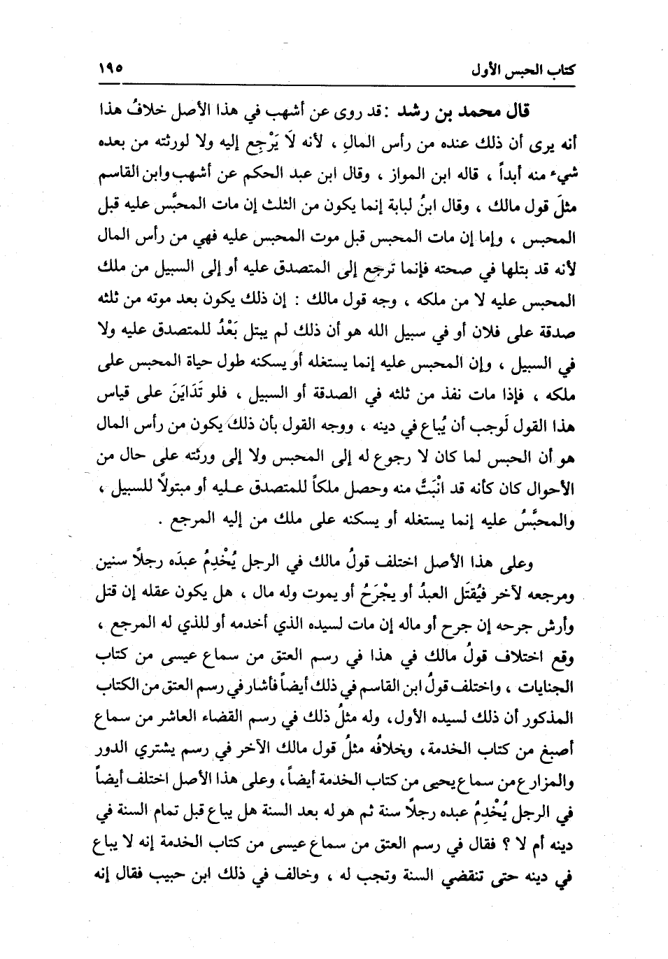قال محمد بن رشد: قد روى عن أشهب في هذا الأصل خلافُ هذا أنه يرى أن ذلك عنده من رأس المالِ؛ لأنه لَا يَرْجِع إليه ولا لورثته من بعده شيء منه أبدا، قاله ابن المواز، وقال ابن عبد الحكم عن أشهب وابن القاسم مثلَ قول مالك، وقال ابنُ لبابة إنما يكون من الثلث إن مات المحبَّس عليه قبل المحبس، وإما إن مات المحبس قبل موت المحبس عليه فهي من رأس المال لأنه قد بتلها في صحته فإنما ترجع إلى المتصدق عليه أو إلى السبيل من ملك المحبس عليه لا من ملكه، وجه قول مالك: إن ذلك يكون بعد موته من ثلثه صدقة على فلان أو في سبيل الله هو أن ذلك لم يبتل بَعْدُ للمتصدق عليه ولا في السبيل، وإن المحبس عليه إنما يستغله أو يسكنه طول حياة المحبس على ملكه، فإذا مات نفذ من ثلثه في الصدقة أو السبيل، فلو تَدَايَنَ على قياس هذا القول لَوجب أن يُباع في دينه، ووجه القول بأن ذلك يكون من رأس المال هو أن الحبس لما كان لا رجوع له إلى المحبس ولا إلى ورثته على حال من الأحوال كان كأنه قد أنْبَتّ منه وحصل ملكا للمتصدق عليه أو مبتولا للسبيل، والمحبَّسُ عليه إنما يستغله أو يسكنه على ملك من إليه المرجع.