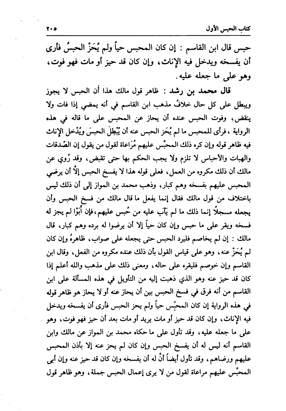 قال محمد بن رشد: ظاهر قول مالك هذا أَن الحبس لا يجوز ويبطل على كل حال خلافُ مذهب ابن القاسم في أنه يمضي إذا فات ولا ينقض، وفوت الحبس عنده أن يحاز عن المحبس على ما قاله في هذه الرواية، فرأى للمحبس ما لم يُحَز الحبس عنه أن يُبْطِلَ الحبسَ ويُدْخل الإناث فيه ظاهر قوله وإن كره ذلك المحبس عليهم مُرَاعاة لقول من يقول إن الصدقات والهبات والأحباس لا تلزم ولا يجب الحكم بها حتى تقبض، وقد رُوي عن مالك أن ذلك مكروه من العمل، فعلى قوله هذا لا يفسخ الحبس إلّا أن يرضي المحبس عليهم بفسخه وهم كبار، وذهب محمد بن المواز إلى أنَ ذلك ليس باختلاف من قول مالك: فقال: إنما يفعل ما قال مالك من فسخ الحبس وأن يجعله مسجلا إنما ذلك ما لم يَأبَ عليه من حُبس عليهم، فإن أبَوْا لم يجز له فسخه ويقر على ما حبس وإن كان حيا إلا أن يرضوا له برده وهم كبار، قال مالك: إن لم يخاصم فليرد الحبس حتى يجعله على صواب، ظاهرهُ وإن كان لم يحَزْ عنه، وهو على قياس القول بأن ذلك عنده مكروه من الفعل، وقال ابن القاسم: وإن خوصم فليقره على حاله، ومعنى ذلك على مذهب والله أعلم إذا كان قد حيز عنه وهو الذي ذهبت إليه من التأويل في هذه المسألة على ابن القاسم من أنه فرق في فسخ الحبس بين أن يحاز عنه أو لا يحاز هو ظاهر قوله في هذه الرواية إن كان المحبِّس حيا ولم يحز الحبس فأرى أن يفسخه ويدخل فيه الإِناث، وإن كان قد حيز أو مات يريد أو مات بعد أن حيز فهو فوت، وهو على ما جعله عليه، وقد تأول على ما حكاه محمد بن المواز عن مالك وابن القاسم أنه ليس له أن يفسخ الحبس وإن كان لم يحز عنه إلا بأذن المحبس عليهم ورضاهم، وقد تأول أيضَاَ أنَ له أن يفسخه وإن كان قد حيز عنه وإن أبى المحبَّس عليهم مراعاة لقول من لا يرى إعمال الحبس جملة، وهو ظاهر قول