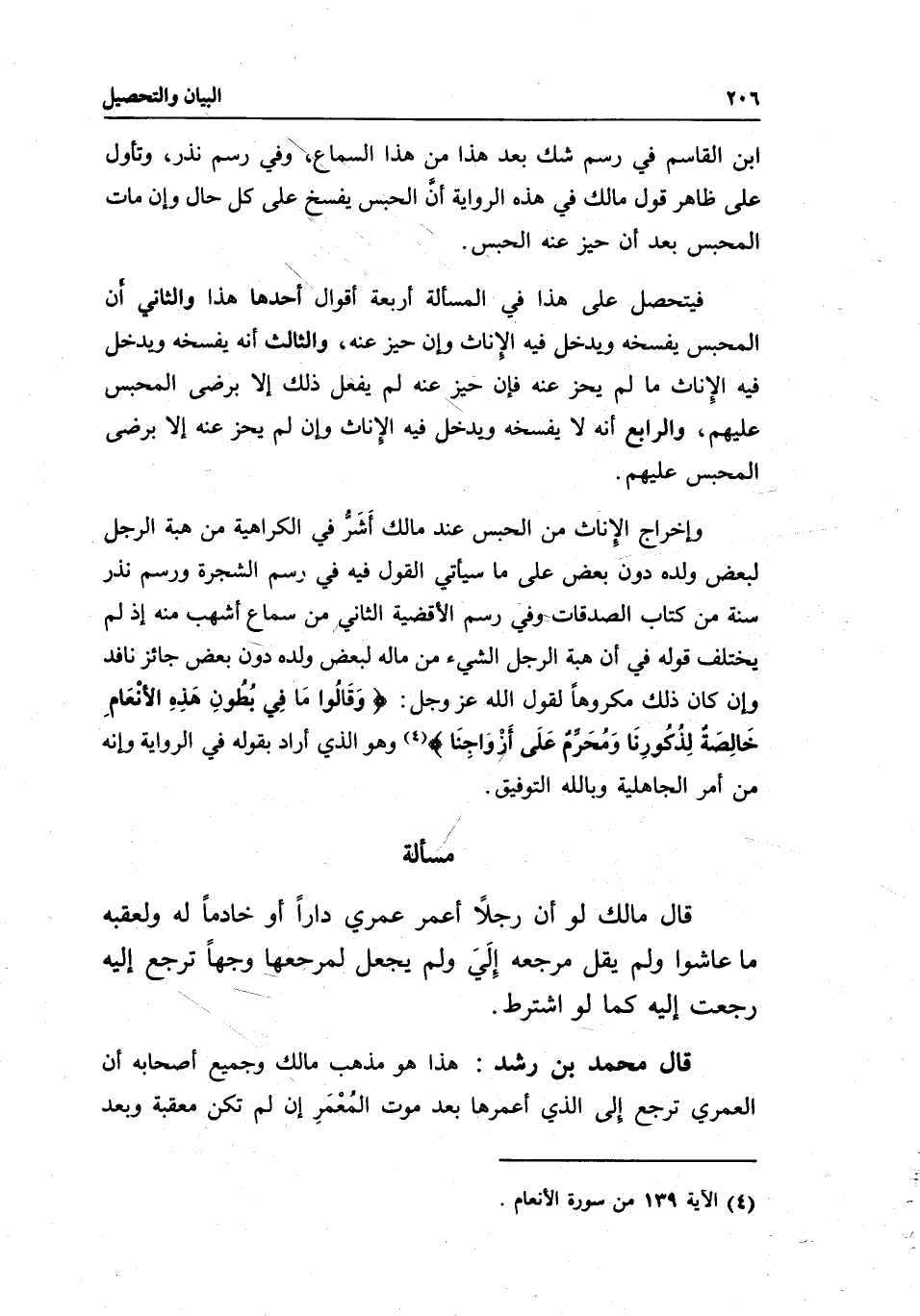 وإخراج الإِناث من الحبس عند مالك أَشَرُّ في الكراهية من هبة الرجل لبعض ولده دون بعض على ما سيأتي القول فيه في رسم الشجرةِ ورسم نذر سنة من كتاب الصدقات وفي رسم الأقضية الثاني من سماع أشهب منه إذ لم يختلف قوله في أن هبة الرجل الشيء من ماله لبعض ولده دون بعض جائز نافد وإن كان ذلك مكروها لقول الله عز وجل: {وَقَالُوا مَا فِي بُطُونِ هَذِهِ الأَنْعَامِ خَالِصَةٌ لِذُكُورِنَا وَمُحَرَّمٌ عَلَى أَزْوَاجِنَا} [الأنعام: 139] وهو الذي أراد بقوله في الرواية وإنه من أمر الجاهلية وبالله التوفيق.