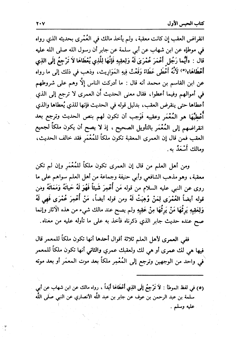 انقراض العقب إِن كانت معقبة، ولم يأخذ مالك في العُمْرى بحديثه الذي رواه في موطئه عن ابن شهاب عن أبي سلمة عن جابر أن رسول الله صَلَّى اللَّهُ عَلَيْهِ قال: «أَيُّما رَجلٍ أَعْمَرَ عُمْرَىَ لَهُ وَلِعقِبِهِ فَإنَّهَا للذِي يُعْطَاهَا لاَ تَرْجِعُ إلَى الذِي أَعْطَاهَا» لَأنَّه أَعْطَى عَطَاء وَقَعْتْ فِيهِ المَوَارِيث، وذهب في ذلك إلى ما رواه عن ابن القاسم بن محمد أنه قال: ما أدركت الناس إِلَّا وهم على شروطهم في أموالهم وفيما أعطوا، فقال معنى الحديث أن العمرى لا ترجع إلى الذي أعطاها حتى ينقرض العقب، بدليل قوله في الحديث فإنها للذي يُعطاها والذي أعْطِيِّهَا هو المُعْمَر وعقيبه فَوَجب أن تكون لهم بنص الحديث وترجع بعد انقراضهم إلى المُعْمَر بالتأويل الصحيح، إذ لا يصح أن يكون ملكا لجميع العقب فمن قال إن العمرى المعقبة تكون ملكا للمُعْمَرِ فقد خالف الحديث، ومالك أَسْعَدُ به.