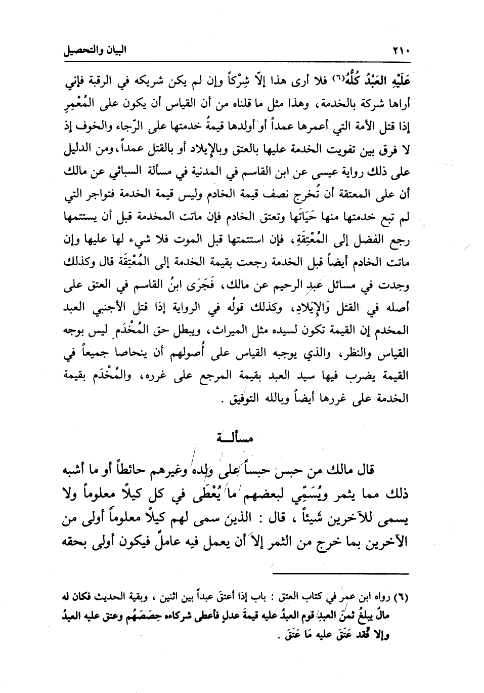 عَلَيْهِ العَبْدُ كُلُّهُ» فلا أرى هذا إلّا شِرْكا وإن لم يكن شريكه في الرقبة فإني أراها شركة بالخدمة، وهذا مثل ما قلناه من أن القياس أن يكون على المُعْمِرِ إذا قتل الأمة التي أعمرها عمدا أو أولدها قيمةُ خدمتها على الرّجاء والخوف إذ لا فرق بين تفويت الخدمة عليها بالعتق وبالإِيلاد أو بالقتل عمدا، ومن الدليل على ذلك رواية عيسى عن ابن القاسم في المدنية في مسألة السبائي عن مالك أن على المعتقة أن تُخرج نصف قيمة الخادم وليس قيمة الخدمة فتواجر التي لم تبع خدمتها منها حَيَاتَها وتعتق الخادم، فإن ماتت المخدمة قبل أن يستتمها رجع الفضل إلى المُعْتِقَةِ، فإن استتمتها قبل الموت فلا شيء لها عليها، وإن ماتت الخادم أيضا قبل الخدمة رجعت بقيمة الخدمة إلى المُعْتِقَة، قال: وكذلك وجدت في مسائل عبد الرحيم عن مالك، فَجَرَى ابنُ القاسم في العتق على أصله في القتل وَالإِيَلادِ، وكذلك قولُه في الرواية: إذا قتل الأجنبي العبد المخدم إن القيمة تكون لسيده مثل الميراث، ويبطل حق المُخْدَم ليس بوجه القياس والنظر، والذي يوجبه القياس على أُصولهم أن يتحاصا جميعا في القيمة يضرب فيها سيد العبد بقيمة المرجع على غرره، والمُخْدَم بقيمة الخدمة على غررها أيضا وبالله التوفيق.
