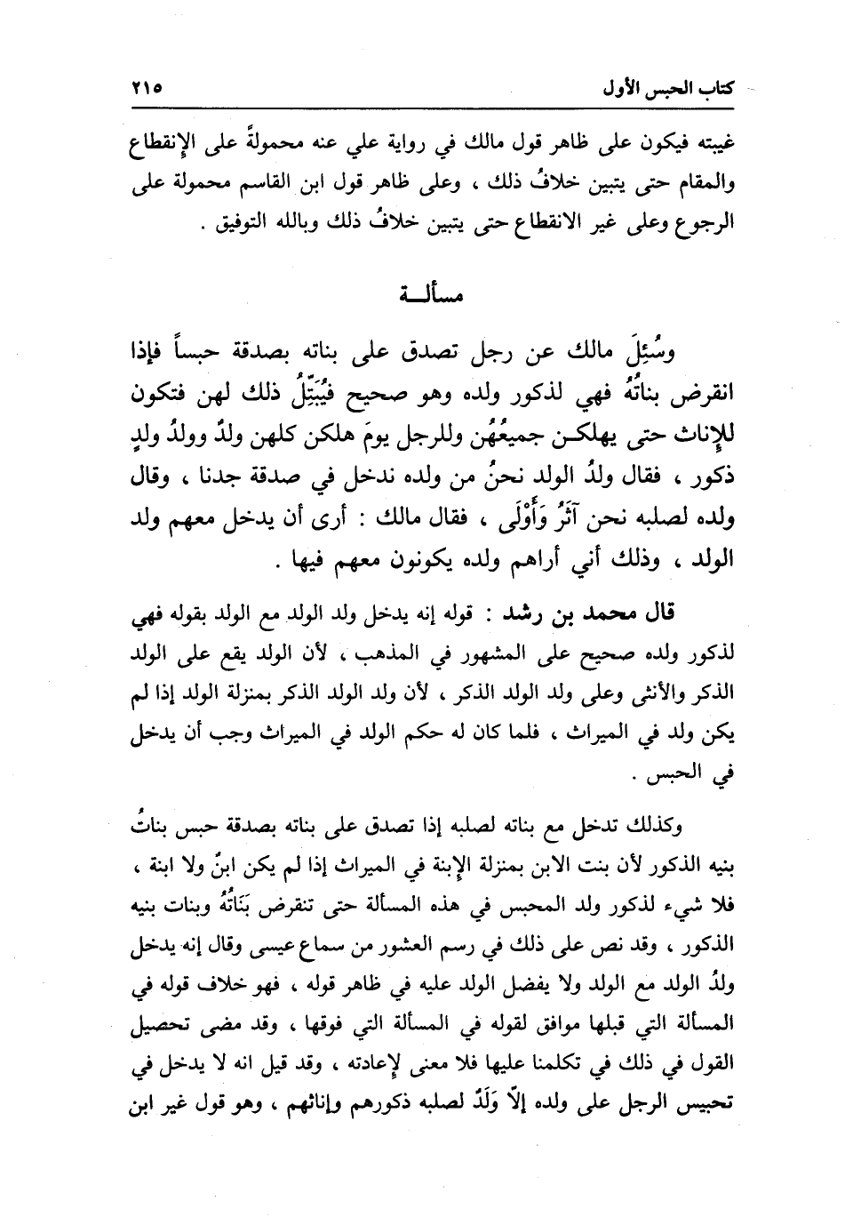 مسألة وسُئِلَ مالك عن رجل تصدق على بناته بصدقة حبسا فإذا انقرض بناتُهُ فهي لذكور ولده وهو صحيح فيُبَتِّلُ ذلك لهن فتكون للِإناث حتى يهلكن جميعُهُن وللرجل يومَ هلكن كلهن ولدٌ وولدُ ولدٍ ذكور، فقال ولدُ الولد: نحنُ من ولده ندخل في صدقة جدنا، وقال ولده لصلبه: نحن آثَرُ وَأوْلَى، فقال مالك: أرى أن يدخل معهم ولد الولد، وذلك أني أراهم ولده يكونون معهم فيها.