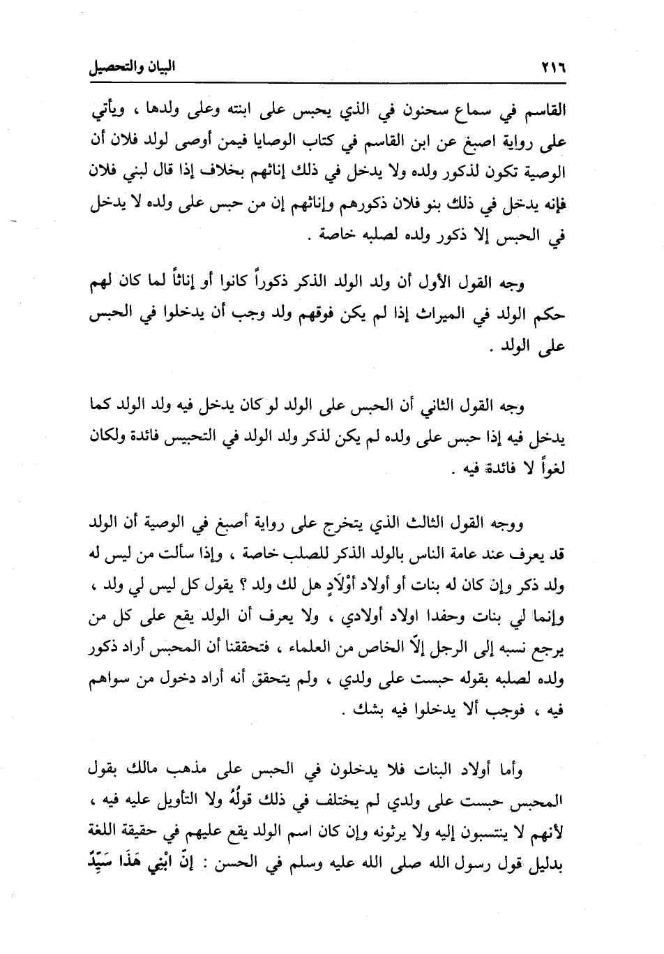 وأما أولاد البنات فلا يدخلون في الحبس على مذهب مالك بقول المحبس: " حبست على ولدي " لم يختلف في ذلك قولُهُ ولا التأويل عليه فيه؛ لأنهم لا ينتسبون إليه ولا يرثونه وإن كان اسم الولد يقع عليهم في حقيقة اللغة بدليل قول رسول الله - صَلَّى اللَّهُ عَلَيْهِ وَسَلَّمَ - في الحسن: «إنّ ابْنِي هَذَا سَيد