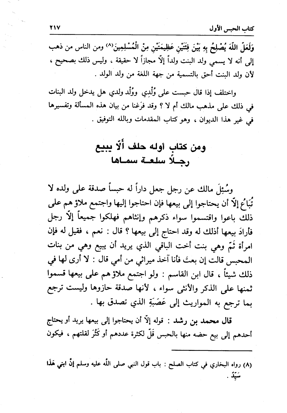 واختلف إذا قال حبست على وُلْدِي ووُلْد ولدي هل يدخل ولد البنات في ذلك على مذهب مالك أم لا؟ وقد فرَغنا من بيان هذه المسألة وتفسيرها في غير هذا الديوان، وهو كتاب المقدمات وبالله التوفيق.