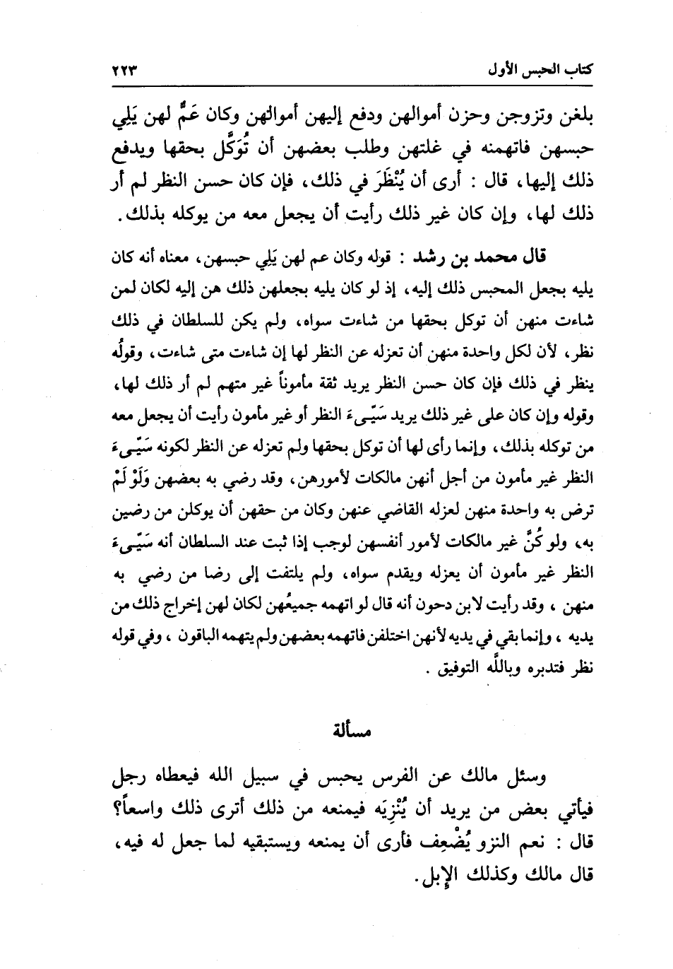 مسألة وسئل مالك عن الفرس يحبس في سبيل الله فيعطاه رجل فيأتي بعض من يريد أن يُنْزِيَه فيمنعه من ذلك أترى ذلك واسعا؟ قال: نعم النزو يُضْعِف فأرى أن يمنعه ويستبقيه لما جعل له فيه، قال مالك: وكذلك الإِبل.
