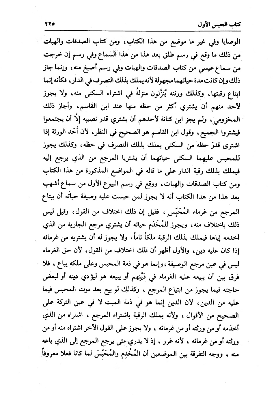 الوصايا وفي غير ما موضع من هذا الكتاب، ومن كتاب الصدقات والهبات من ذلك ما وقع في رسم طلق بعد هذا من هذا السماع وفي رسم إن خرجت من سماع عيسى من كتاب الصدقات والهبات وفي رسم أصبغ منه، وإنما جاز ذلك وإن كانت مدة حياتهما مجهولة لأنه يملك بذلك التصرف في الدار، فكأنه إنما ابتاع رقبتها، وكذلك ورثته يُنَزَلون منزلةُ في اشتراء السكنى منه، ولا يجوز لأحد منهم أن يشتري أكثر من حظه منها عند ابن القاسم، وأجاز ذلك المخزومي، ولم يجز ابن كنانة لأحدهم أن يشتري قدر نصيبه إِلَّا أن يجتمعوا فيشتروا الجميع، وقول ابن القاسم هو الصحيح في النظر؛ لأن أَحَد الورثة إذا اشترى قدرَ حظه من السكنى يملك بذلك التصرف في حظه، وكذلك يجوز للمحبس عليهما السكنى حياتهما أن يشتريا المرجع من الذي يرجع إليه فيملك بذلك رقبة الدار على ما قاله في المواضع المذكورة من هذاَ الكتاب، ومن كتاب الصدقات والهبات، ووقع في رسم البيوع الأول من سماع أشهب بعد هذا من هذا الكتاب أنه لا يجوز لمن حبست عليه وصيفة حياتَه أن يبتاع المرجع من غرماء المُحَبِّس، فقيل إن ذلك اختلاف من القول، وقيل ليس ذلك باختلاف منه، ويجوز للمُخَدَم حياته أن يشتري مرجع الجارية من الذي أخدمه إياها فيملك بذلك الرقبة ملكا تاما، ولا يجوز له أن يشتريه من غرمائه إذا كان عليه دين، والأول أظهر أن ذلك اختلاف من القول؛ لأن حق الغرماء ليس في عين مرجع الوصيفة، وإنما هو في ذمة المحبس وعلى ملكه يباع، فلا فرق بين أن يبيعه عليه الغرماء في دَيْنِهم أو يبيعه هو ليؤدي دينه أو لبعض حاجته فيما يجوز من ابتياع المرجع، وكذلك لو بيع بعد موت المحبس فيما عليه من الدين؛ لأن الدين إِنما هو في ذمة الميت لا في عين التركة على الصحيح من الأقوال، ولأنه يملك الرقبة باشتراء المرجع، اشتراه من الذي أخدمه أو من ورثته أو من غرمائه، ولا يجوز على القول الآخر اشتراه منه أو من ورثته أو من غرمائه؛ لأنه غرر، إذ لا يدري متى يرجع المرجع إلى الذي باعه منه، ووجه التفرقة بين الموضعين أن المُخْدِم والمُحَبِّسَ لما كانا فعلا معروفا