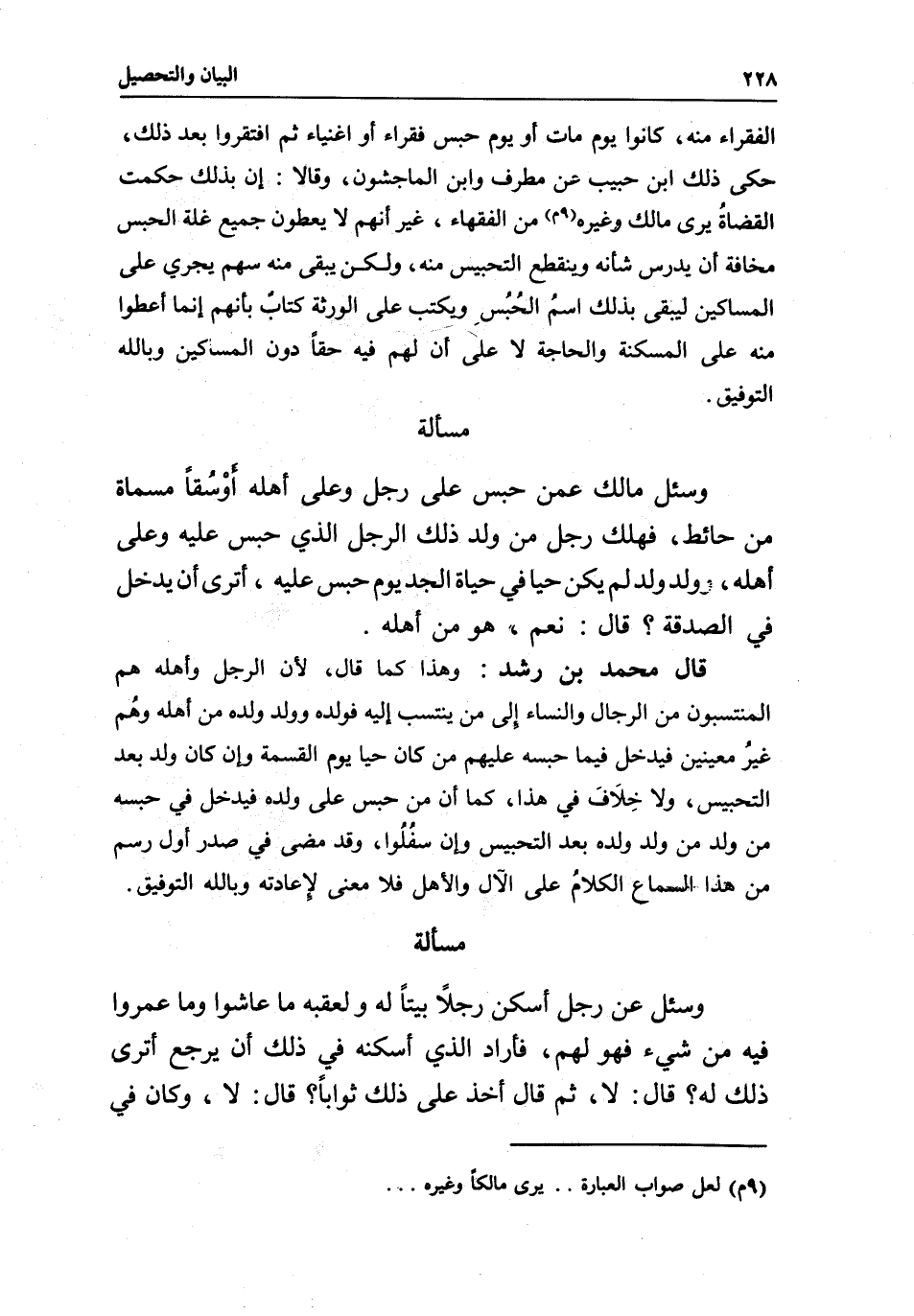 الفقراء منه، كانوا يوم مات أو يوم حبس فقراء أو أغنياء ثم افتقروا بعد ذلك، حكى ذلك ابن حبيب عن مطرف وابن الماجشون، وقالا: إن بذلك حكمت القضاةُ يرى مالك وغيره من الفقهاء غير أنهم لا يعطون جميع غلة الحبس مخافة أن يدرس شأنه وينقطع التحبيس منه، ولكن يبقى منه سهم يجري على المساكيِن ليبقى بذلك اسمُ الحُبُس ويكتب على الورثة كتابٌ بأنهم إنما أعطوا منه على المسكنة والحاجة لا على أن لهم فيه حقا دون المساكين وبالله التوفيق.