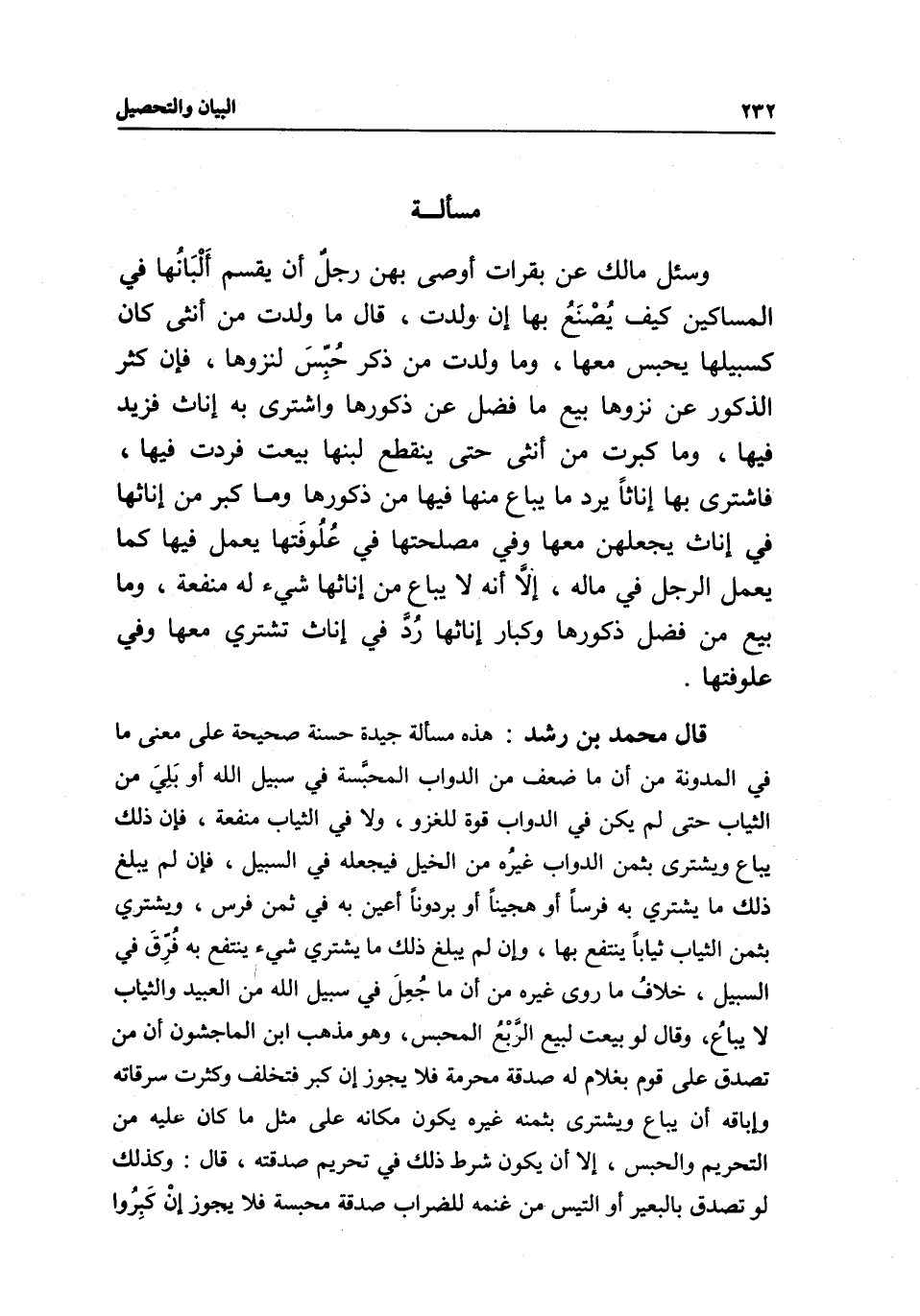 قال محمد بن رشد: هذه مسألة جيدة حسنة صحيحة على معنى ما في المدونة من أن ما ضعف من الدواب المحبَّسة في سبيل الله أو بَلِيَ من الثياب حتى لم يكن في الدواب قوة للغزو، ولا في الثياب منفعة، فإن ذلك يباع ويشترى بثمن الدواب غيرُه من الخيل فيجعله في السبيل، فإن لم يبلغ ذلك ما يشتري به فرسا أو هجينا أو برذونا أعين به في ثمن فرس، ويشتري بثمن الثياب ثيابا ينتفع بها، وإن لم يبلغ ذلك ما يشتري شيء ينتفع به فُرِّقَ في السبيل، خلافُ ما روى غيره من أن ما جُعِلَ في سبيل الله من العبيد والثياب لا يباعُ، وقال: لو بيعت لبيع الربْعُ المحبس، وهو مذهب ابن الماجشون أن من تصدق على قوم بغلام له صدقة محرمة فلا يجوز إن كبر فتخلف وكثرت سرقاته وإباقه أن يباع ويشترى بثمنه غيره يكون مكانه على مثل ما كان عليه من التحريم والحبس، إلا أن يكون شرط ذلك في تحريم صدقته، قال: وكذلك لو تصدق بالبعير أو التيس من غنمه للضراب صدقة محبسة فلا يجوز إنْ كَبِرُوا