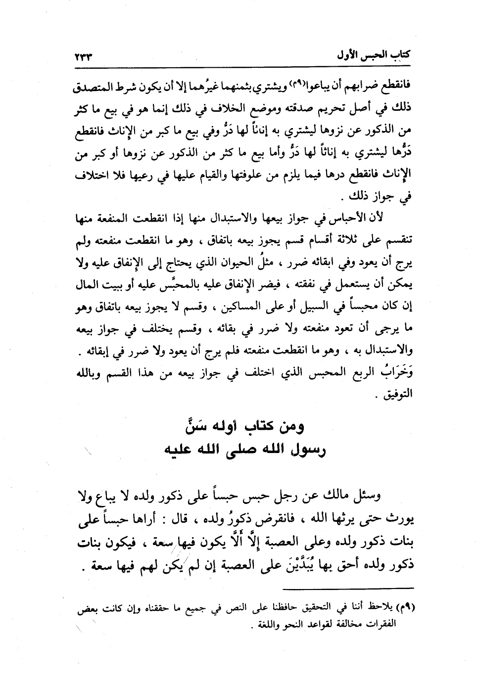 رسول الله صَلَّى اللَّهُ عَلَيْهِ وسئل مالك عن رجل حبس حبسا على ذكور ولده لا يباعِ ولا يورث حتى يرثها الله، فانقرض ذكورُ ولده، قال: أراها حبساَ على بنات ذكور ولده وعلى العصبة إِلَّا أَلَّا يكون فيها سعة، فيكون بنات ذكور ولده أحق بها يُبَدَّيْنَ على العصبة إن لم يكن لهم فيها سعة.
