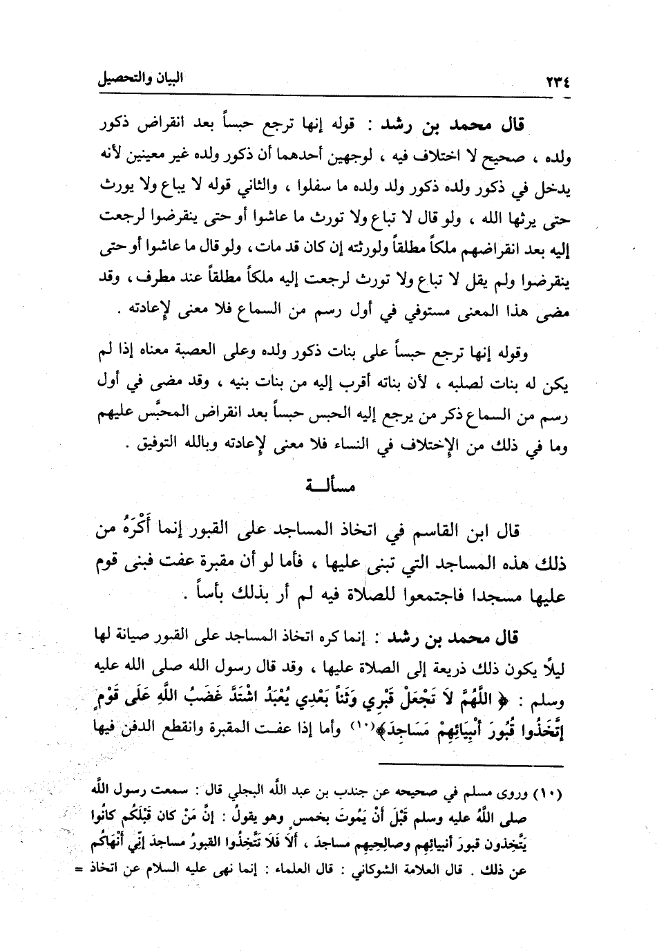 مسألة قال ابن القاسم في اتخاذ المساجد على القبور: إنما أَكْرَهُ من ذلك هذه المساجد التي تبنى عليها، فأما لو أن مقبرة عفت فبنى قوم عليها مسجدا فاجتمعوا للصلاة فيه لم أر بذلك بأسا.