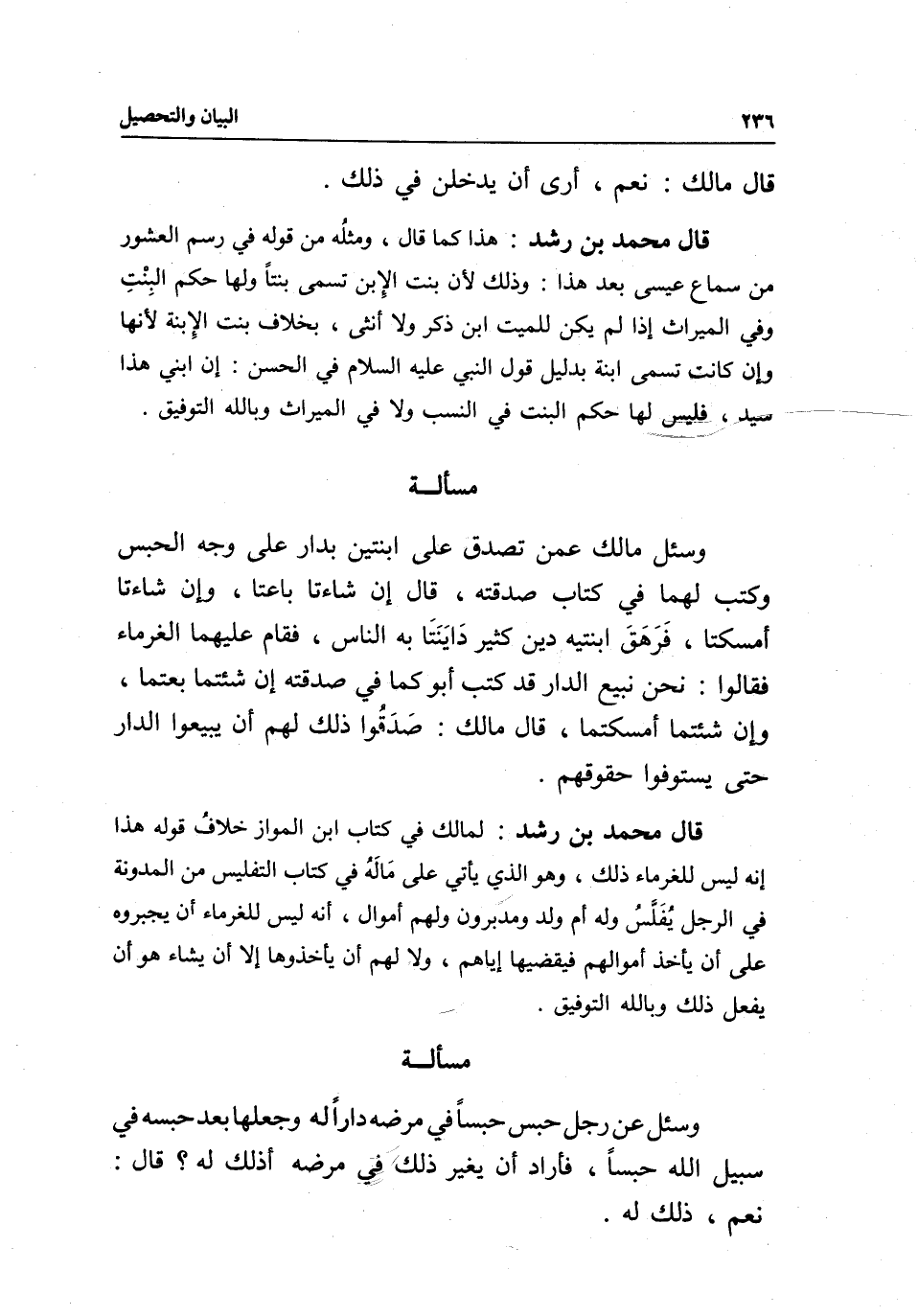 " قال محمد بن رشد: هذا كما قال، ومثلُه من قوله في رسم العشور من سماع عيسى بعد هذا: وذلك لأن بنت الِابن تسمى بنتا ولها حكم البِنْتِ وفي الميراث إذا لم يكن للميت ابن ذكر ولا أنثى، بخلاف بنت الاِبنة لأنها وإن كانت تسمى ابنة بدليل قول النبي - عَلَيْهِ السَّلَامُ - في الحسن: «إن ابني هذا سيد» فليس لها حكم البنت في النسب ولا في الميراث وبالله التوفيق.
