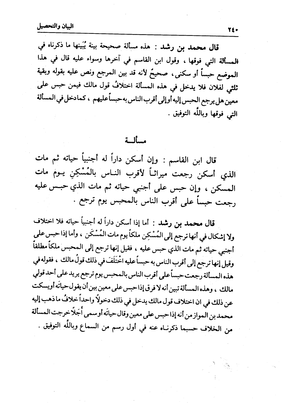قال محمد بن رشد: أما إذا أسكن دارا له أجنبيا حياته فلا اختلاف ولا إشكَال في أنها ترجع إلى المُسْكِن ملكا يوم مات المُسْكَن، وأما إذا حبس على أجنبي حياته ثم مات الذي حبس عليه، فقيل إنها ترجع إلى المحبس ملكا مطلقا، وقيل إنها ترجع إلى أقرب الناس به حبسا عليه، اخْتَلَفَ في ذلك قولُ مالك، فقوله في هذه المسألة رجعت حبسا على أقرب الناس بالمحبس يوم ترجع يريد على أحد قولي مالك، وهذه المسألة تبين أنه لا فرق إذا حبس على معين بين أن يقول حياتَه أو يسكت عن ذلك في إن اختلاف قول مالك يدخل في ذلك دخولا واحدا خلافُ ما ذهب إليه محمد بن المواز من أنه إذا حبس على معين وقال حياتَه أو سمى أجَلا خرجت المسألة من الخلاف حسبما ذكرناه عنه في أول رسم من السماع وباللَّه التوفيق.