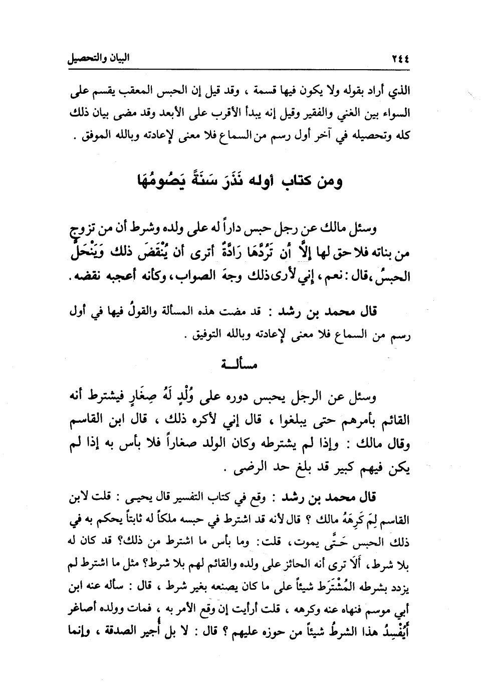 ومن كتاب أوله: نَذَرَ سَتَة يَصُومُهَا وسئل مالك عن رجل حبس دارا له على ولده وشرط أن من تزوج من بناته فلا حق لها إلا أَن تَرُدَهَا رَادَّة أترى أن يُنْقَضَ ذلك وَينْحَل الحبسُ، قال: نعم، إني لأرى ذلك وجهَ الصواب، وكأنه أعجبه نقضه.