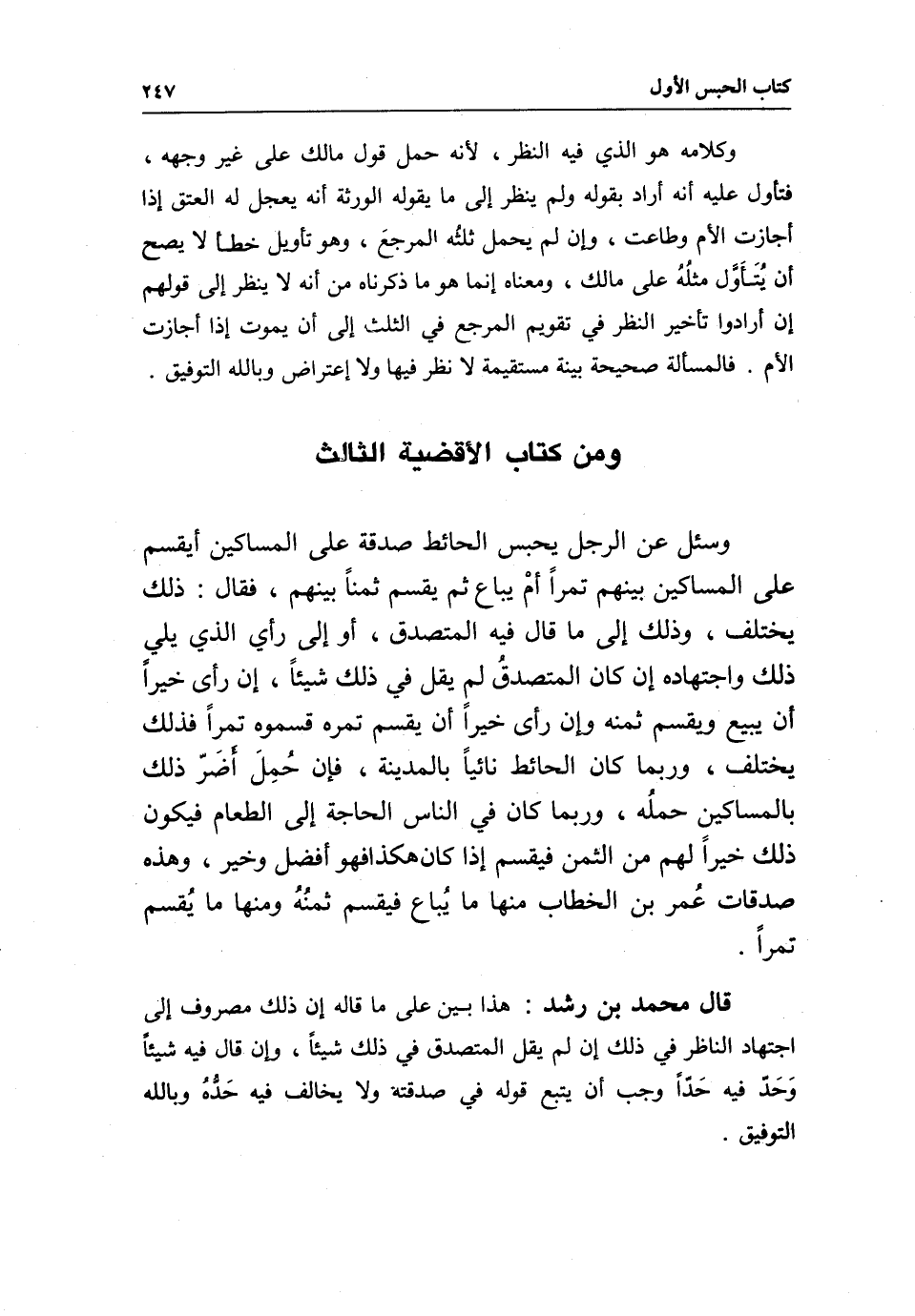 ومن كتاب الأقضية الثالث وسئل عن الرجل يحبس الحائط صدقة على المساكين أيقسم على المساكين بينهم تمرا أمْ يباع ثم يقسم ثمنا بينهم، فقال: ذلك يختلف، وذلك إلى ما قال فيه المتصدق، أو إلى رأي الذي يلي ذلك، واجتهاده إن كان المتصدقُ لمِ يقل في ذلك شيئا، إن رأى خيرا أن يبيع ويقسم ثمنه وإن رأى خيراَ أن يقسم تمره قسموه تمرا فذلك يختلف، وربما كان الحائط نائيا بالمدينة، فإن حُمِلَ أضَرّ ذلك بالمساكين حملُه، وربما كان في الناس الحاجة إلى الطعام فيكون ذلك خيرا لهم من الثمن فيقسم إذا كان هكذا فهو أفضل وخير، وهذه صدقات عُمر بن الخطاب منها ما يُباع فيقسم ثمنُهُ ومنها ما يُقسم تمرا.