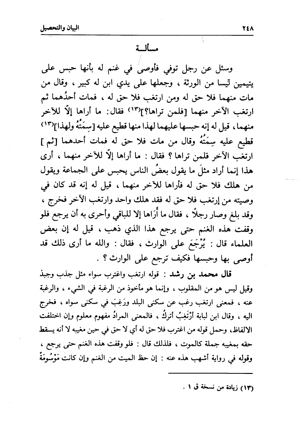 قال محمد بن رشد: قوله ارتغب واغترب سواء مثل جذب وجبذ وقيل ليس هو من المقلوب، وإنما هو مأخوذ من الرغبة في الشيء، والرغبة عنه، فمعنى ارتغب رغب عن سكنى البلد ورَغِبَ في سكنى سواه، فخرج إليه، وقال ابن لبابة أرْتَغبُ أتركُ، فالمعنى المرادُ مفهوم معلوم وإن اختلفت الألفاظ، وحمل قوله من اغترب فلا حق له أي لا حق في حين مغيبه لا أنه يسقط حقه بمغيبه جملة كالموت، فلذلك قال: فلو وقفت هذه الغنم حتى يرجع، وقوله في رواية أشهب هذه عنه: إن حظ الميت من الغنم وإن كانت مَوْسُومَة