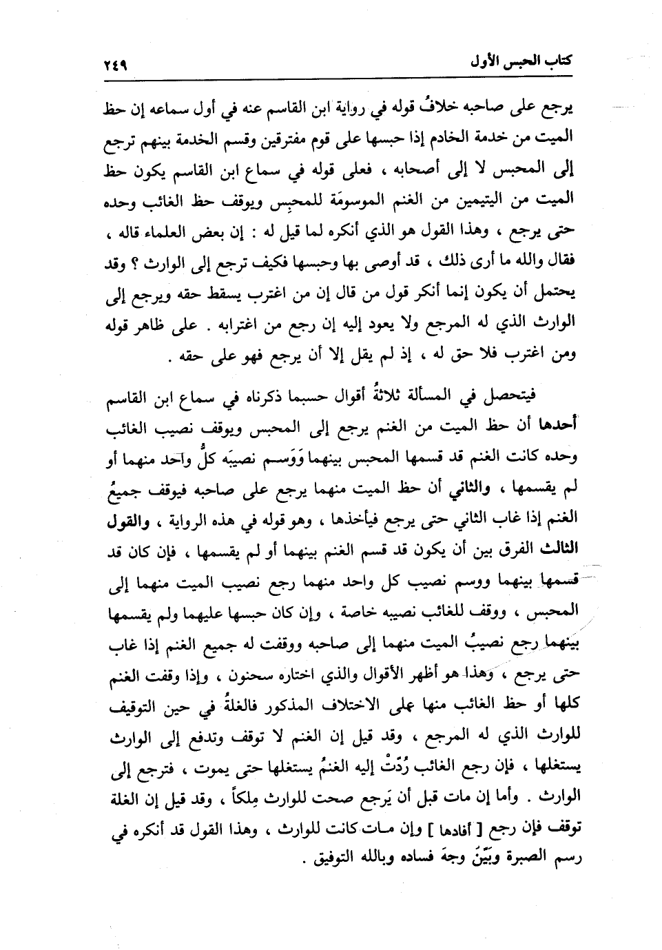 فيتحصل في المسألة ثلاثةُ أقوال حسبما ذكرناه في سماع ابن اِلقاسم أحدها: أن حظ الميت من الغنم يرجع إلى المحبس ويوقف نصيب الغائب وحده كانت الغنم قد قسمها المحبس بينهما وَوَسم نصيبَه كل واحد منهما أو لم يقسمها، والثاني: أن حظ الميت منهما يرجع على صاحبه فيوقف جميعُ الغنم إذا غاب الثاني حتى يرجع فيأخذها، وهو قوله في هذه الرواية، والقول الثالث: الفرق بين أن يكون قد قسم الغنم بينهما أو لم يقسمها، فإن كان فد قسمها بينهما ووسم نصيب كل واحد منهما رجع نصيب الميت منهما إلى المحبس، ووقف للغائب نصيبه خاصة، وإن كان حبسها عليهما ولم يقسمها بينهما رجع نصيبُ الميت منهما إلى صاحبه ووقفت له جميع الغنم إذا غاب حتى يرجع، وهذا هو أظهر الأقوال والذي اختاره سحنون، وإذا وقفت الغنم كلها أو حظ الغائب منها كلى الاختلاف المذكور فالغلةُ في حين التوقيف للوارث الذي له المرجع، وقد قيل إن الغنم لا توقف وتدفع إلى الوارث يستغلها، فإن رجع الغائب رُدّتْ إليه الغنمُ يستغلها حتى يموت، فترجع إلى الوارث، وأما إن مات قبل أن يَرجع صحت للوارث مِلكا، وقد قيل إن الغلة توقف فإن رجع [أفادها] وإن مات كانت للوارث، وهذا القول قد أنكره في رسم الصبرة وبَيّن وجهَ فساده وبالله التوفيق.