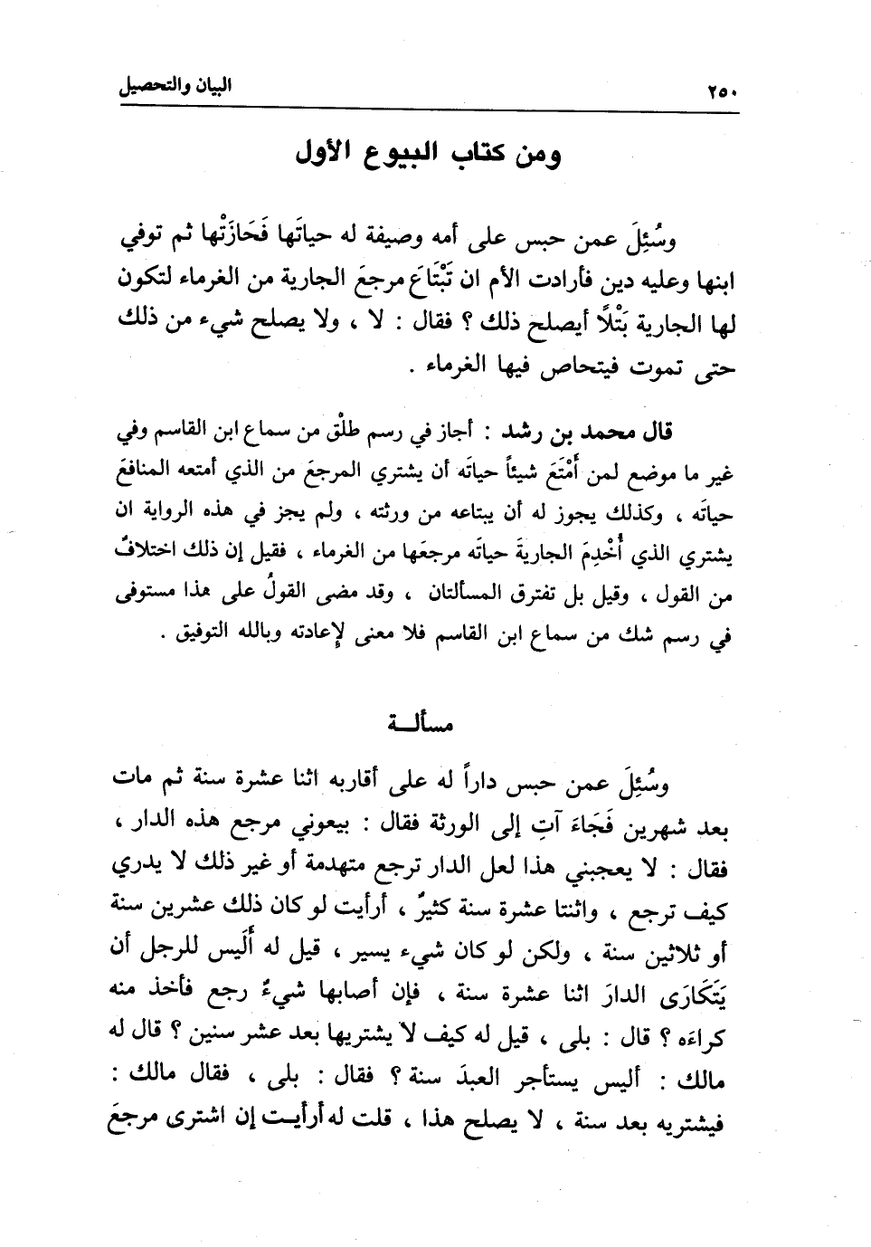 ومن كتاب البيوع الأول وسُئِلَ عمن حبس على أمه وصيفة له حياتَها فَحَازَتْها، ثم توفي ابنها وعليه دين فأرادت الأم أن تَبْتَاعَ مرجعَ الجارية من الغرماء لتكون لها الجارية بَتْلا أيصلح ذلك؟ فقال: لا، ولا يصلح شيء من ذلك حتى تموت فيتحاص فيها الغرماء.