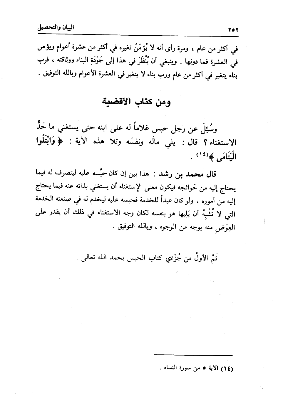 ومن كتاب الأقضية وسُئِلَ عن رجل حبس غلاما له على ابنه حتى يستغني ما حَدُّ الاستغناء؟ قال: يلي مالَه ونفسَه وتلا هذه الآية: {وَابْتَلُوا الْيَتَامَى} [النساء: 6] .