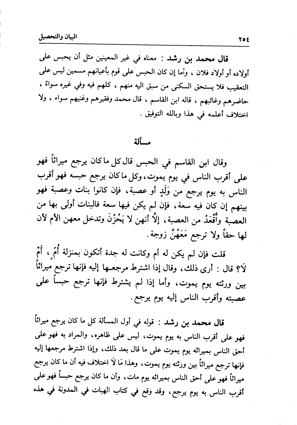 مسألة وقال ابن القاسم في الحبس، قال: كل ما كان يرجع ميراثا فهو على أقرب الناس في يوم يموت، وكل ما كان يرجع حبسه فهو أقرب الناس به يوم يرجع من وَلَدٍ أو عصبة، فإن كانوا بنات وعصبة فهو بينهم إن كان فيه سعة، فإن لم يكن فيها سعة فالبنات أولى بها من العصبة، وأقْعَدُ من العصبة، إلَا أنهن لا يَحُزْنَ وتدخل معهن الأم؛ لأن لها حقا ولا ترجع مَعَهُنَّ زوجة.