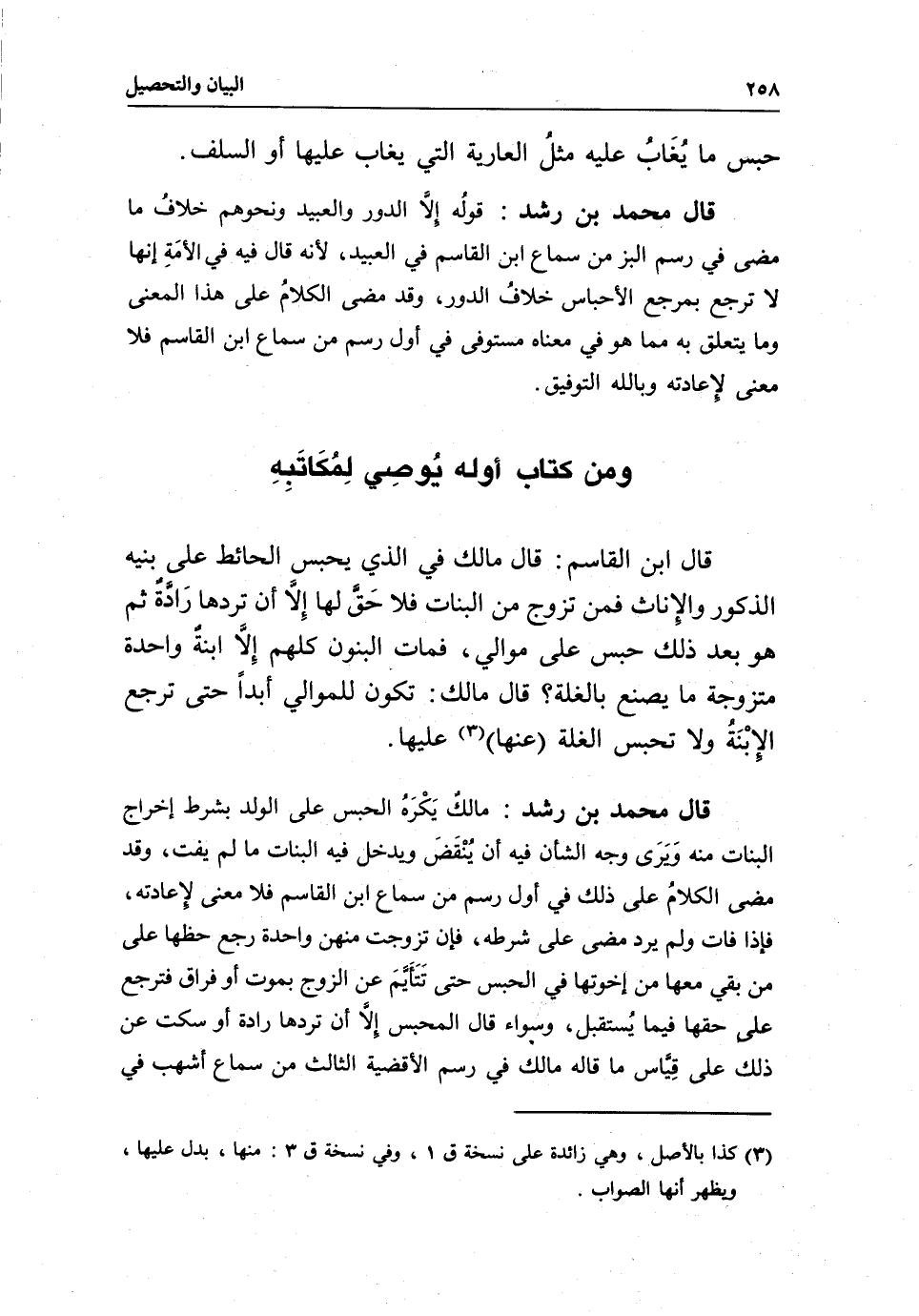 قال محمد بن رشد: قوله إلا الدور والعبيد ونحوهم خلاف ما مضى في رسم البز من سماع ابن القاسم في العبيد؛ لأنه قال فيه في الأمة إنها لا ترجع بمرجع الأحباس خلاف الدور، وقد مضى الكلام على هذا المعنى، وما يتعلق به مما هو في معناه مستوفى في أول رسم من سماع ابن القاسم فلا معنى لإعادته، وبالله التوفيق.