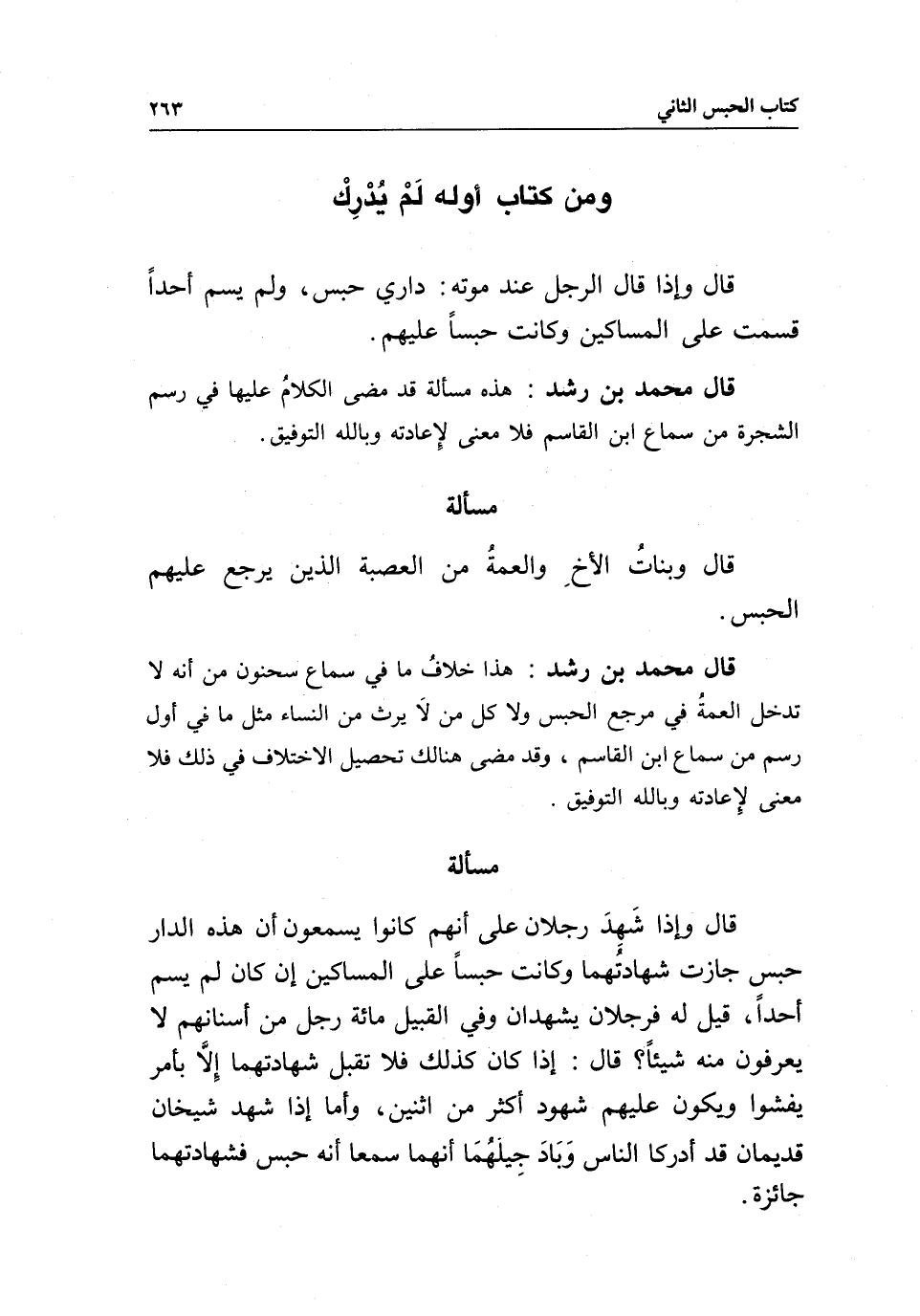 ومن كتاب أوله لم يدرك قال: وإذا قال الرجل عند موته: داري حبس، ولم يسم أحدا قسمت على المساكين وكانت حبسا عليهم.