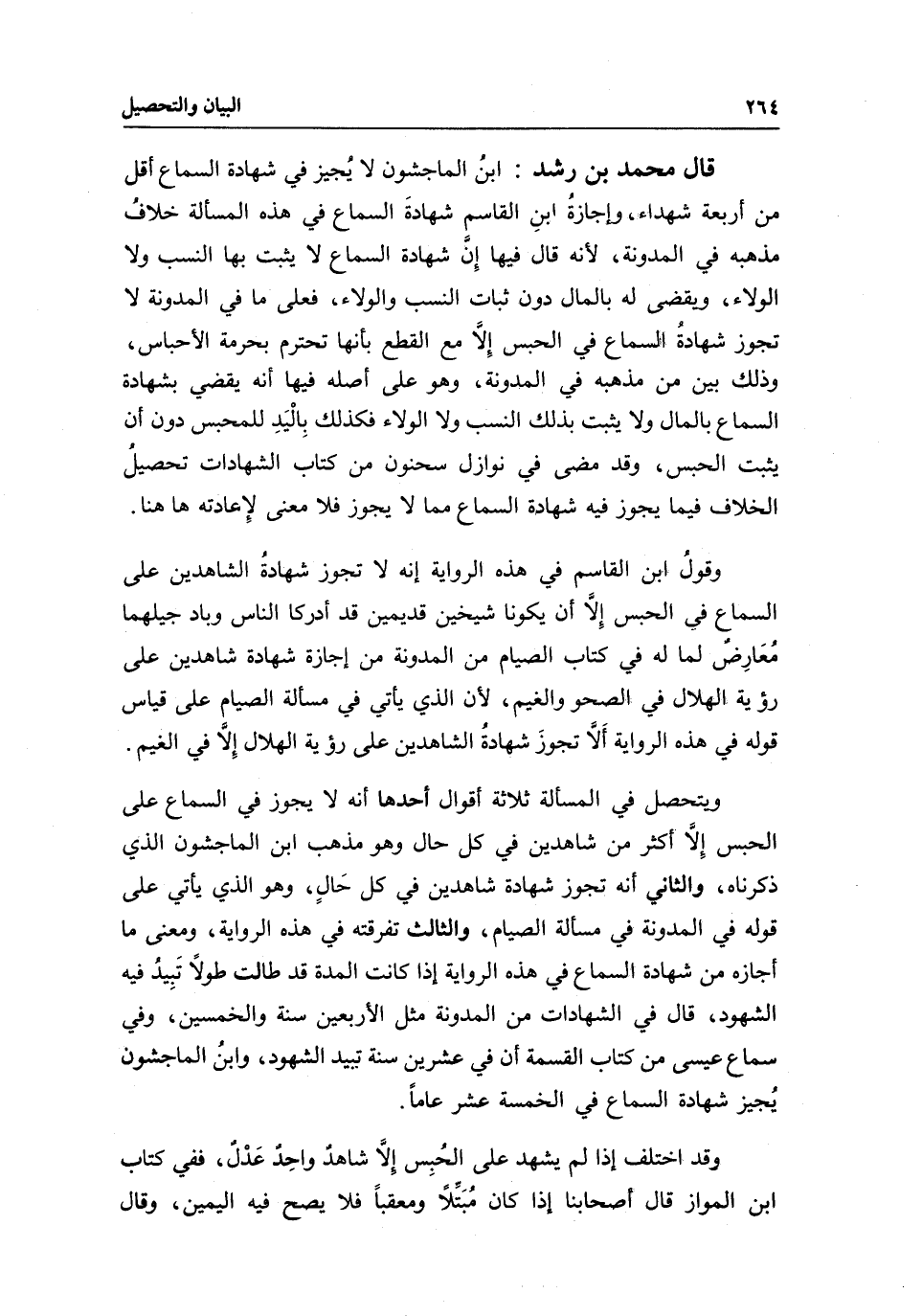 قال محمد بن رشد: ابن الماجشون لا يجيز في شهادة السماع أقل من أربعة شهداء، وإجازة ابن القاسم شهادة السماع في هذه المسألة خلاف مذهبه في المدونة؛ لأنه قال فيها: إن شهادة السماع لا يثبت بها النسب ولا الولاء، ويقضى له بالمال دون ثبات النسب والولاء، فعلى ما في المدونة لا تجوز شهادة السماع في الحبس إلا مع القطع بأنها تحترم بحرمة الأحباس، وذلك بين من مذهبه في المدونة، وهو على أصله فيها أنه يقضي بشهادة السماع بالمال، ولا يثبت بذلك النسب ولا الولاء، فكذلك باليد للمحبس دون أن يثبت الحبس، وقد مضى في نوازل سحنون من كتاب الشهادات تحصيل الخلاف فيما يجوز فيه شهادة السماع مما لا يجوز، فلا معنى لإعادته هاهنا.