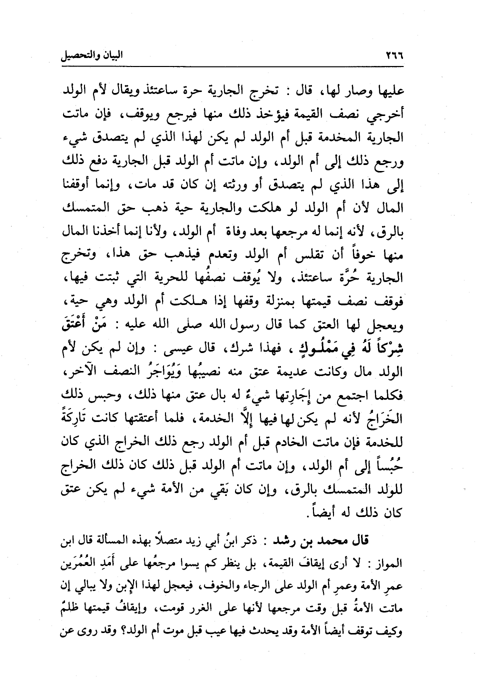 قال محمد بن رشد: ذكر ابن أبي زيد متصلا بهذه المسألة، قال ابن المواز: لا أرى إيقاف القيمة، بل ينظر كم يسوى مرجعها على أمد العمرين عمر الأمة وعمر أم الولد على الرجاء والخوف، فيعجل لهذا الابن ولا يبالى إن ماتت الأمة قبل وقت مرجعها؛ لأنها على الغرر قومت، وإيقاف قيمتها ظلم، وكيف توقف أيضا الأمة وقد يحدث فيها عيب قبل موت أم الولد؟ وقد روى عن