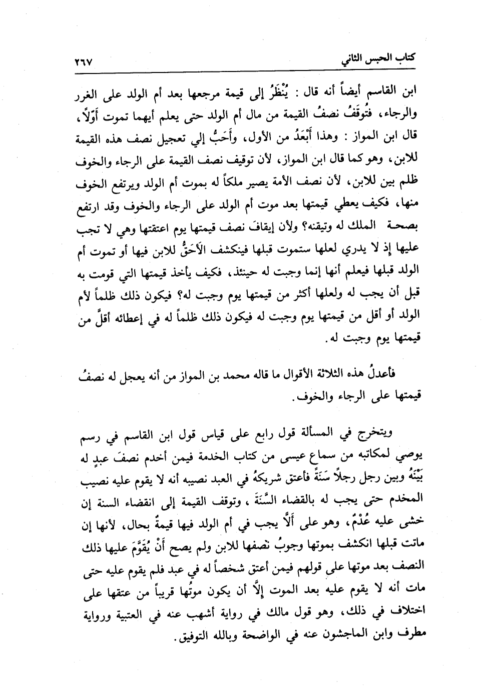 ابن القاسم أيضا أنه قال: ينظر إلى قيمة مرجعها بعد أم الولد على الغرر والرجاء، فتوقف نصف القيمة من مال أم الولد حتى يعلم أيهما تموت أولا، قال ابن المواز: وهذا أبعد من الأول، وأحب إلي تعجيل نصف هذه القيمة للابن، وهو كما قال ابن المواز؛ لأن توقيف نصف القيمة على الرجاء والخوف ظلم بين للابن؛ لأن نصف الأمة يصير ملكا له بموت أم الولد ويرتفع الخوف منها، فكيف يعطي قيمتها بعد موت أم الولد على الرجاء والخوف وقد ارتفع بصحة الملك له وتيقنه؟ ولأن إيقاف نصف قيمتها يوم أعتقتها وهي لا تجب عليها إذ لا يدري لعلها ستموت قبلها فينكشف الأحق للابن فيها أو تموت أم الولد قبلها فيعلم أنها إنما وجبت له حينئذ، فكيف يأخذ قيمتها التي قومت به قبل أن يجب له، ولعلها أكثر من قيمتها يوم وجبت له، فيكون ذلك ظلما لأم الولد أو أقل من قيمتها يوم وجبت له فيكون ذلك ظلما له في إعطائه أقل من قيمتها يوم وجبت له.