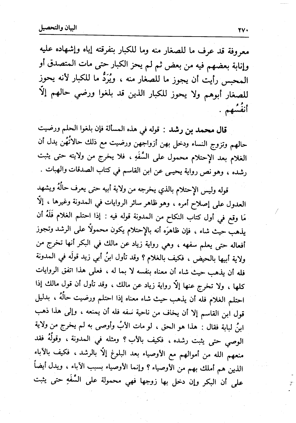 قال محمد بن رشد: قوله في هذه المسألة فإن بلغوا الحلم ورضيت حالهم وتزوج النساء ودخل بهن أزواجهن ورضيت مع ذلك حالاتهن - يدل أن الغلام بعد الاحتلام محمول على السفه، فلا يخرج من ولايته حتى يثبت رشده، وهو نص رواية يحيى عن ابن القاسم في كتاب الصدقات والهبات.
