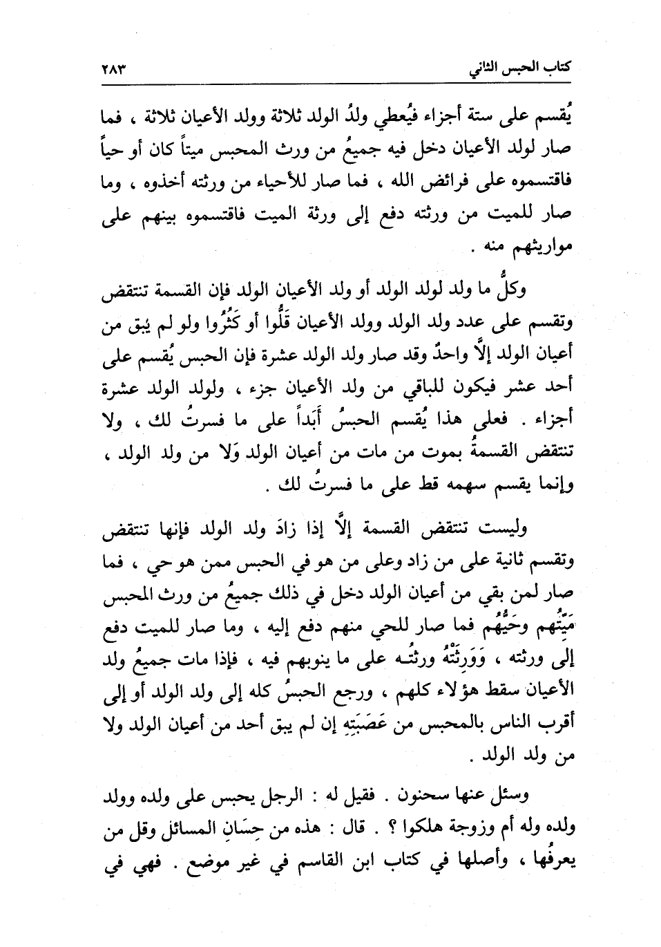 وسئل: عنها سحنون، فقيل له: الرجل يحبس على ولده وولد ولده وله أم وزوجة هلكوا؟ قال: هذه من حسان المسائل وقل من يعرفها، وأصلها في كتاب ابن القاسم في غير موضع، فهي في