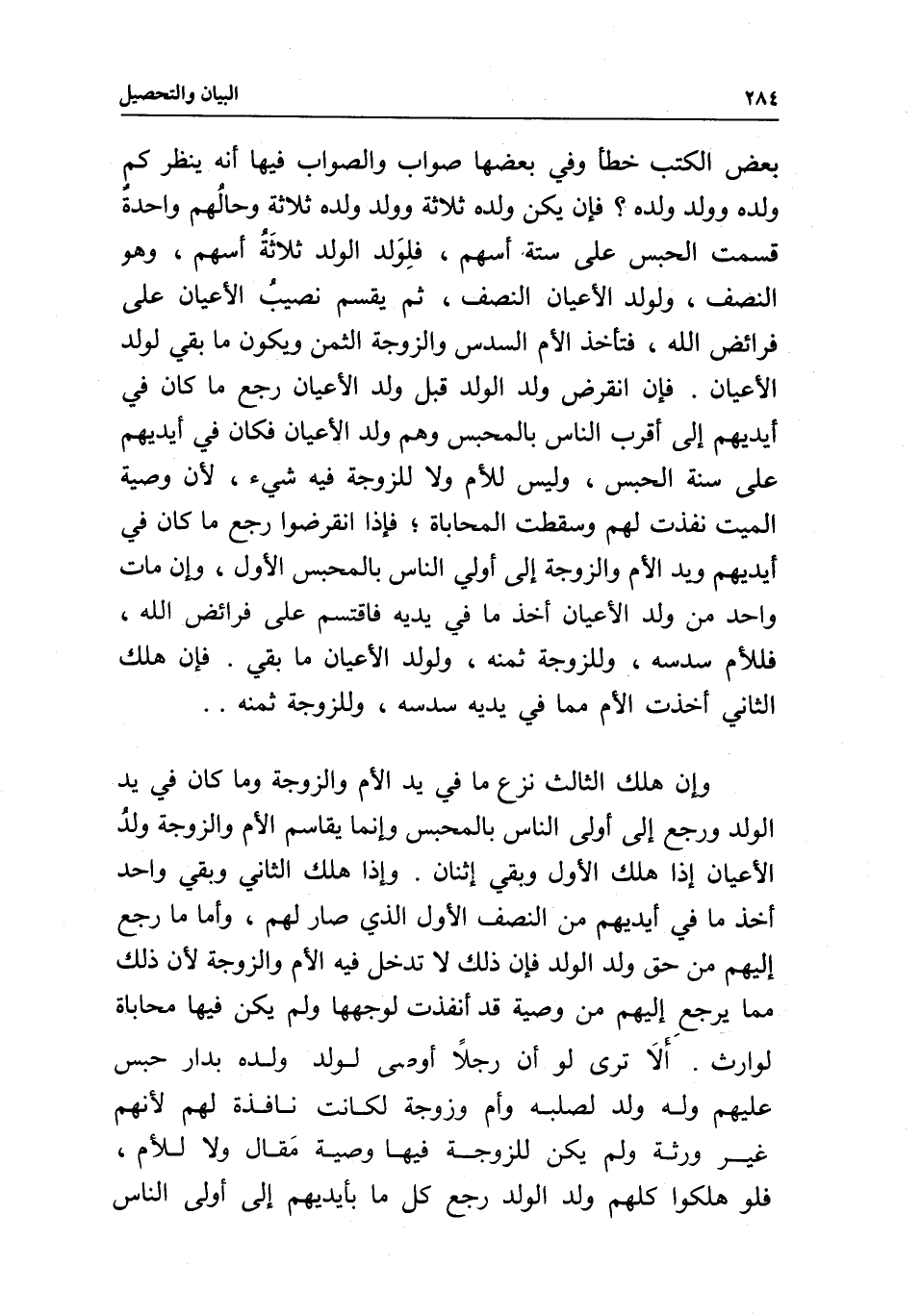 بعض الكتب خطأ وفي بعضها صواب والصواب فيها أنه ينظر كم ولده وولد ولده؟ فإن يكن ولده ثلاثة وولد ولده ثلاثة وحالهم واحدة قسمت الحبس على ستة أسهم، فلولد الولد ثلاثة أسهم، وهو النصف، ولولد الأعيان النصف، ثم يقسم نصيب الأعيان على فرائض الله، فتأخذ الأم السدس والزوجة الثمن ويكون ما بقي لولد الأعيان فإن انقرض ولد الولد قبل ولد الأعيان رجع ما كان في أيديهم إلى أقرب الناس بالمحبس وهم ولد الأعيان فكان في أيديهم على سنة الحبس، وليس للأم ولا للزوجة فيه شيء؛ لأن وصية الميت نفذت لهم وسقطت المحاباة؛ فإذا انقرضوا رجع ما كان في أيديهم ويد الأم والزوجة إلى أولي الناس بالمحبس الأول، وإن مات واحد من ولد الأعيان أخذ ما في يديه فاقتسم على فرائض الله، فللأم سدسه، وللزوجة ثمنه، ولولد الأعيان ما بقي. فإن هلك الثاني أخذت الأم مما في يديه سدسه، وللزوجة ثمنه.