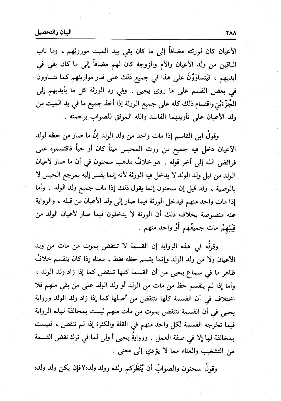 وقوله في هذه الرواية: إن القسمة لا تنتقض بموت من مات من ولد الأعيان ولا من ولد الولد وإنما يقسم حظه فقط، معناه: إذا كان ينقسم - خلاف ظاهر ما في سماع يحيى من أن القسمة كلها تنتقض كما إذا زاد ولد الولد، وأما إذا لم ينقسم حظ من مات من الولد أو ولد الولد على من بقي منهم فلا اختلاف في أن القسمة كلها تنتقض من أصلها كما إذا زاد ولد الولد، ورواية يحيى في أن القسمة تنتقض بموت من مات منهم ليست بمخالفة لهذه الرواية فيما تخرجه القسمة لكل واحد منهم في القلة والكثرة إذا لم تنقض، فليست بمخالفة لها إلا في صفة العمل. ورواية يحيى أولى لما في ترك نقض القسمة من التشغيب والعناء مما لا يؤدي إلى معنى.
