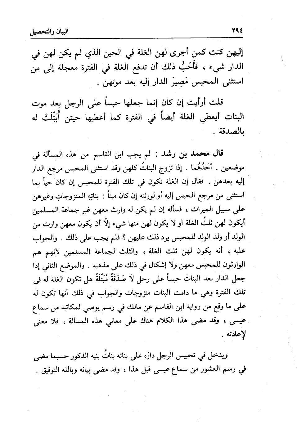 والموضع الثاني: إذا جعل الدار بعد البنات حبسا على رجل لا صدقة مبتلة هل تكون الغلة له في تلك الفترة وهي ما دامت البنات متزوجات، والجواب في ذلك: أنها تكون له على ما وقع من رواية ابن القاسم عن مالك في رسم يوصي لمكاتبه من سماع عيسى، وقد مضى هذا الكلام هناك على معاني هذه المسألة، فلا معنى لإعادته.