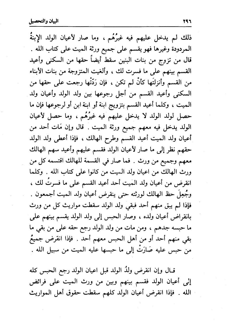 وكلما انقرض من أعيان ولد الميت أحد أعيد القسم على ما فسرت لك، وجعل حظ الهالك لورثته حتى ينقرض أعيان ولد الميت أجمعون.