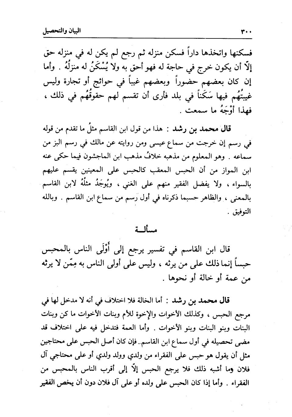 مسألة قال ابن القاسم في تفسير يرجع إلى أولى الناس بالمحبس حبسا: إنما ذلك على من يرثه، وليس على أولى الناس به ممن لا يرثه من عمة أو خالة أو نحوها.