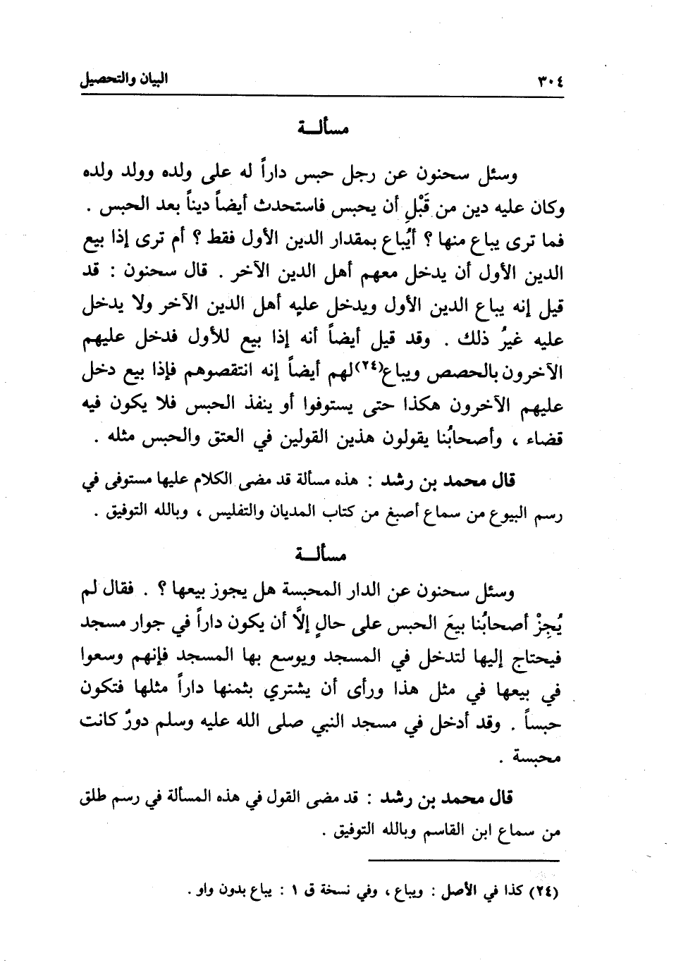 مسألة وسئل سحنون: عن رجل حبس دارا له على ولده وولد ولده وكان عليه دين من قبل أن يحبس فاستحدث أيضا دينا بعد الحبس. فما ترى يباع منها؟ أيباع بمقدار الدين الأول فقط؟ أم ترى إذا بيع الدين الأول أن يدخل معهم أهل الدين الآخر؟