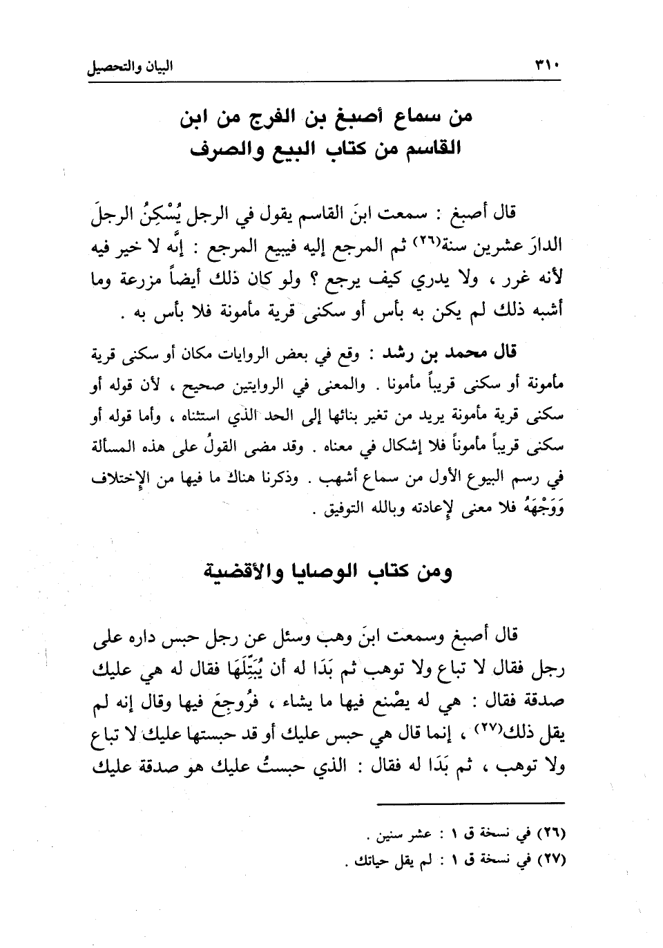ومن كتاب الوصايا والأقضية قال أصبغ: وسمعت ابن وهب، وسئل: عن رجل حبس داره على رجل، فقال: لا تباع ولا توهب، ثم بدا له أن يبتلها، فقال له: هي عليك صدقة، فقال: هي له يصنع فيها ما يشاء، فروجع فيها، وقال: إنه لم يقل ذلك، إنما قال: هي حبس عليك أو قد حبستها عليك لا تباع ولا توهب، ثم بدا له، فقال: الذي حبست عليك هو صدقة عليك