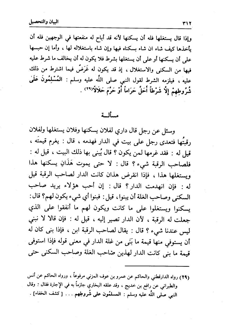 وإذا قال يستغلها فله أن يسكنها لأنه قد أباح له منفعتها في الوجهين فله أن يأخذها كيف شاء إن شاء بسكناه فيها وإن شاء باستغلاله لها، وأما إن حبسها على أن يسكنها أو على أن يستغلها بشرط فلا يكون له أن يخالف ما شرط عليه فيها من السكنى والاستغلال، إذ قد يكون له غرض فيما اشترط من ذلك عليه، فيلزمه الشرط لقول النبي - صَلَّى اللَّهُ عَلَيْهِ وَسَلَّمَ -: «المسلمون على شروطهم إلا شرطا أحل حراما أو حرم حلالا» .