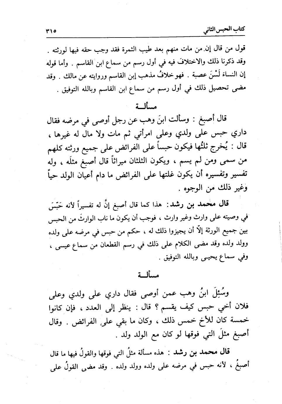 قال محمد بن رشد: هذا كما قال أصبغ إن له تفسيرا لأنه حبس في وصيته على وارث وغير وارث، فوجب أن يكون ما ناب الوارث من الحبس بين جميع الورثة إلا أن يجيزوا ذلك له، حكم من حبس في مرضه على ولده وولد ولده وقد مضى الكلام على ذلك في رسم القطعان من سماع عيسى، وفي سماع يحيى، وبالله التوفيق.