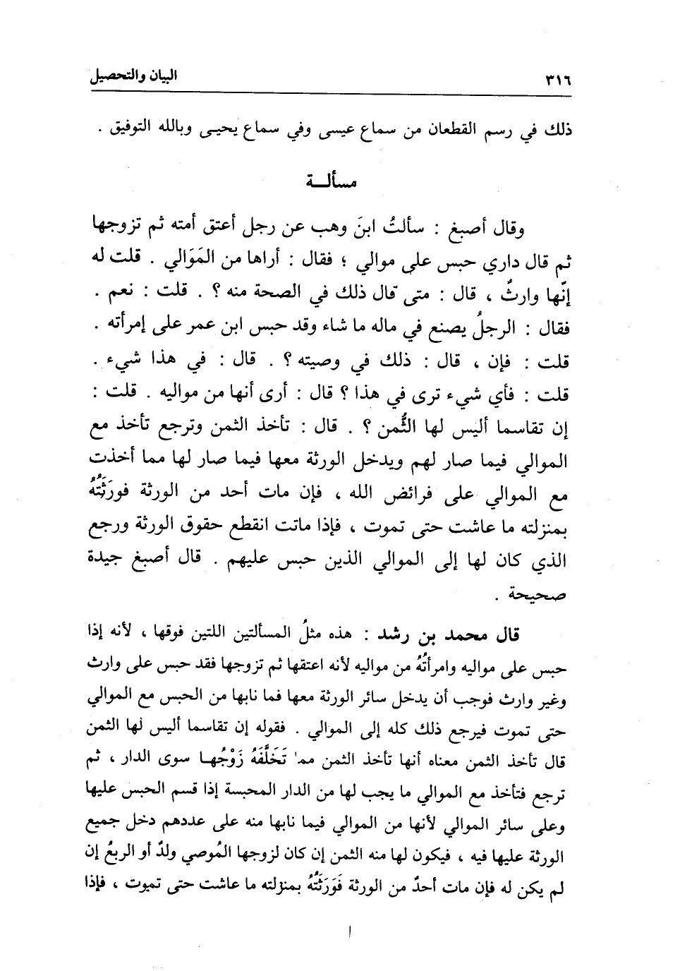 قال محمد بن رشد: هذه مثل المسألتين اللتين فوقها؛ لأنه إذا حبس على مواليه وامرأته من مواليه لأنه اعتقها ثم تزوجها فقد حبس على وارث وغير وارث فوجب أن يدخل سائر الورثة معها فما نابها من الحبس مع الموالي حتى تموت فيرجع ذلك كله إلى الموالي.
