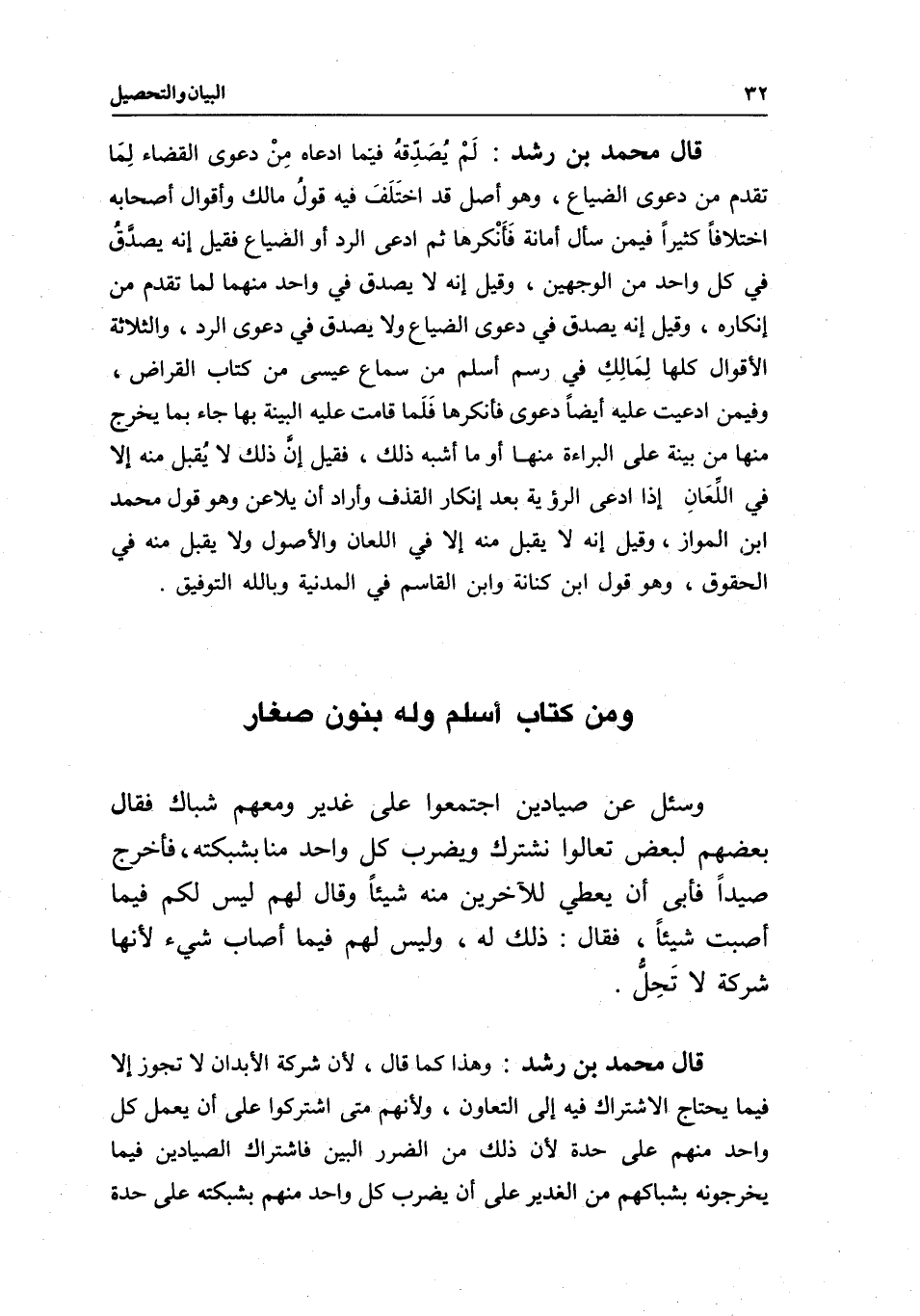 قال محمد بن رشد: وهذا كما قال؛ لأن شركة الأبدان لا تجوز إلا فيما يحتاج الاشتراك فيه إلى التعاون، ولأنهم متى اشتركوا على أن يعمل كل واحد منهم على حدة لأن ذلك من الضرر البين فاشتراك الصيادين فيما يخرجونه بشباكهم من الغدير على أن يضرب كل واحد منهم بشبكته على حدة